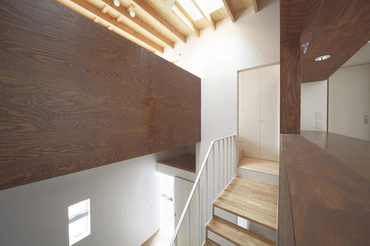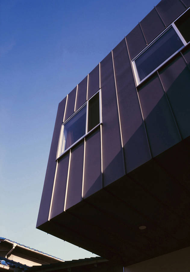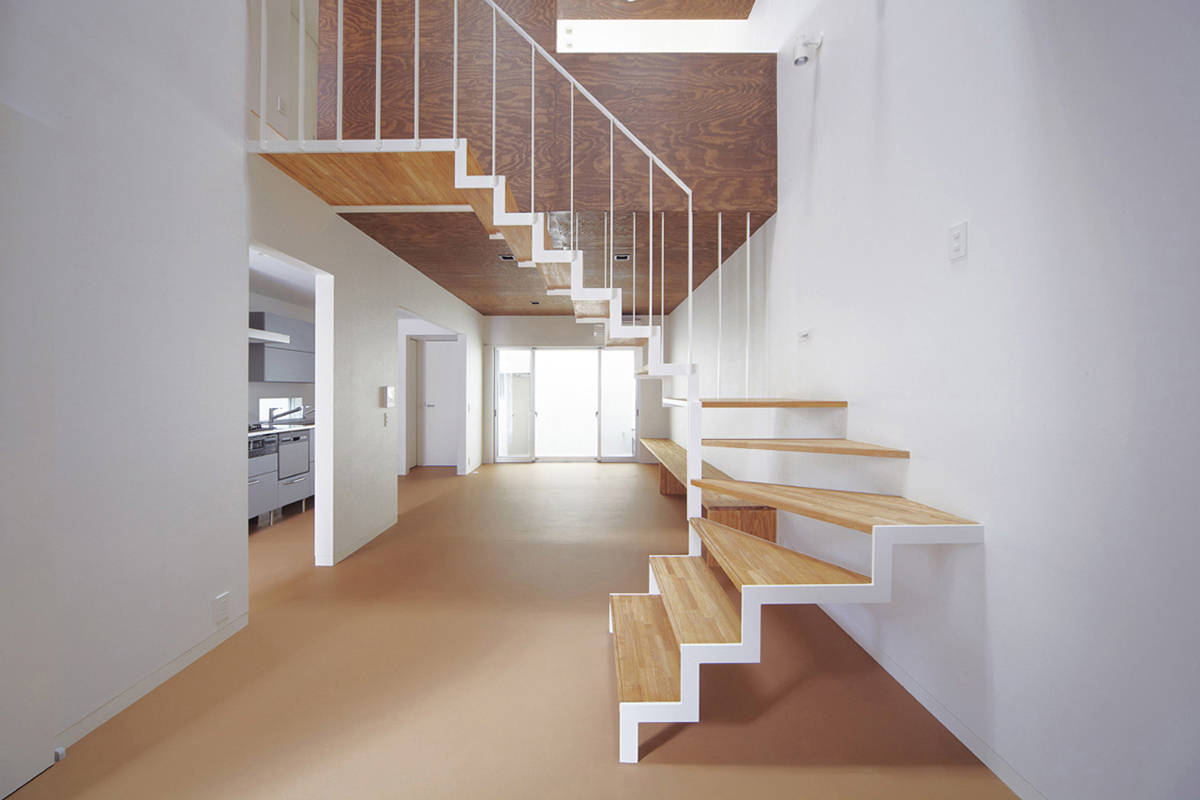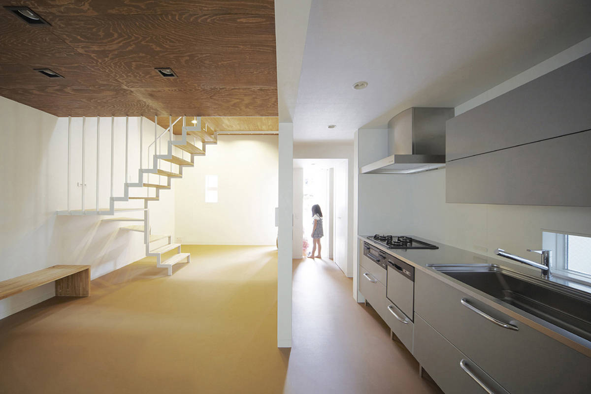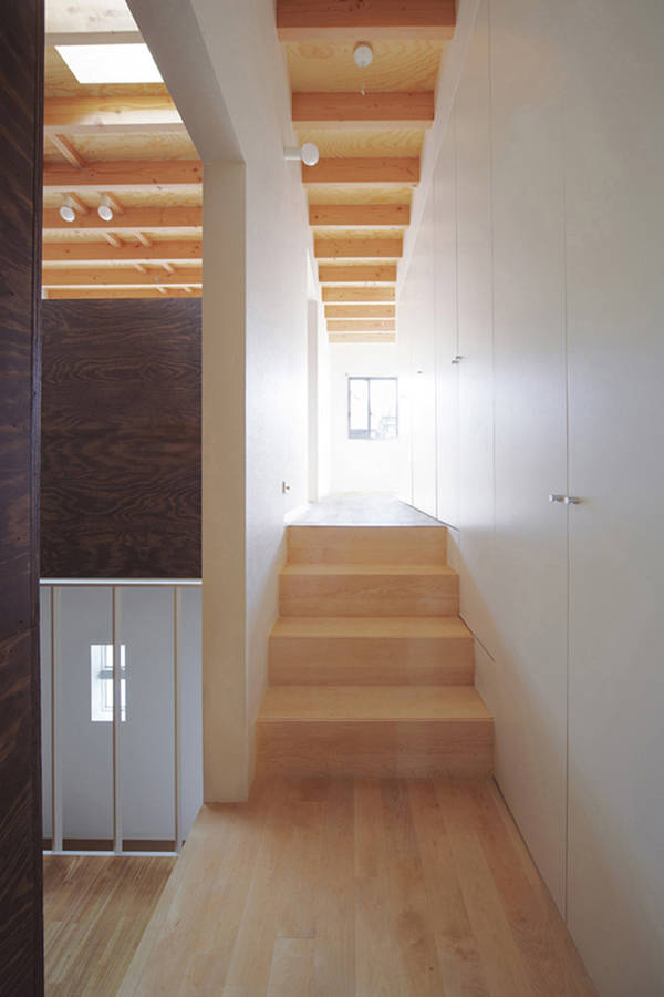 どこからでも子供たちの様子がうかがえる住宅。新居もそんな家族のつながりを保ちたいと思いました。 敷地は間口約6mの密集した住宅地。北側は道路と接していましたが、その他三方は建物に囲まれ、周囲からの採光や通風は期待し難い環境でした。また、敷地の北側も道路際は駐車と駐輪のスペースとすることが求められました。