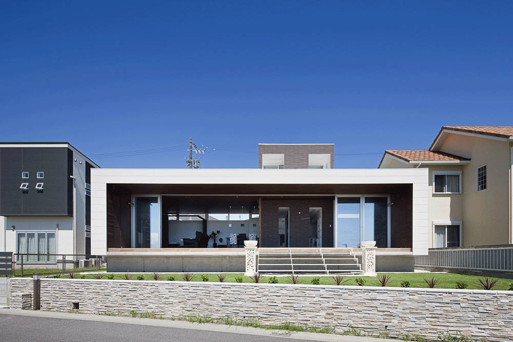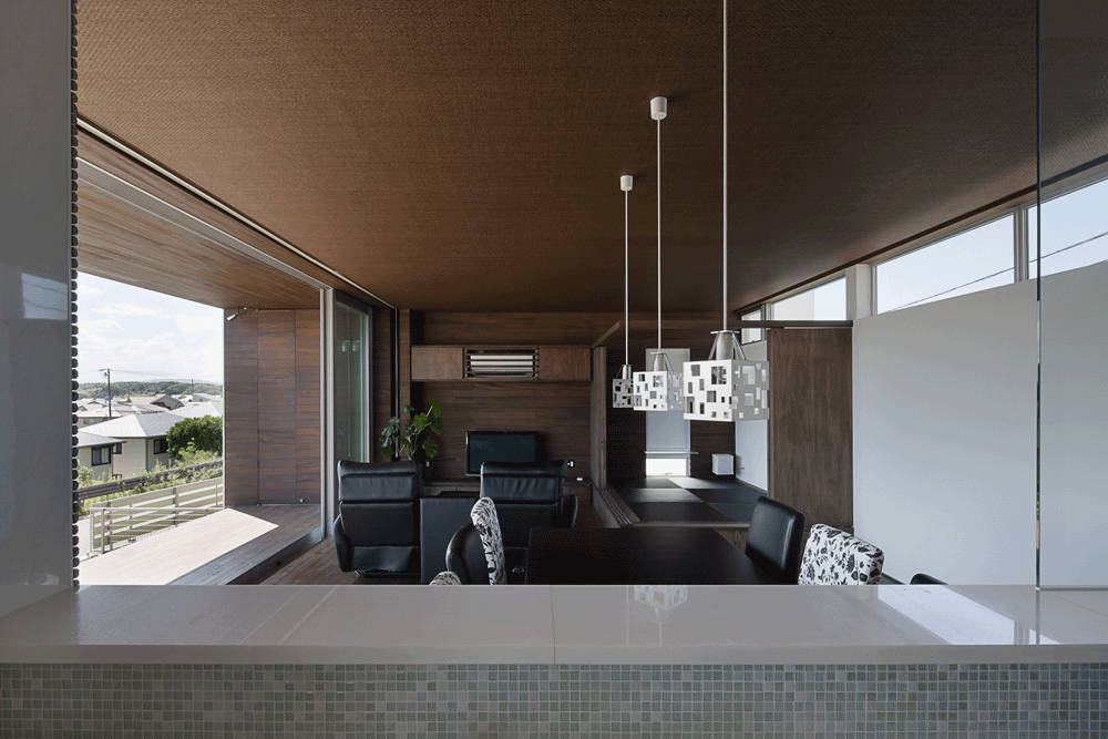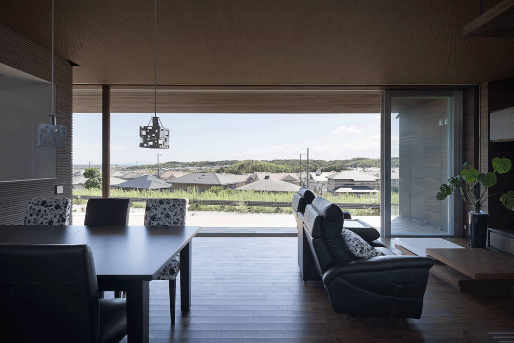 1階は、東西間口いっぱい横に連続させて部屋を配置し、目の前のすばらしい風景を出来るだけ室内に取り込むようにしました。南側の窓を開け放つとテラスとリビングは一体となり、風が通り抜ける心地よい空間になります。