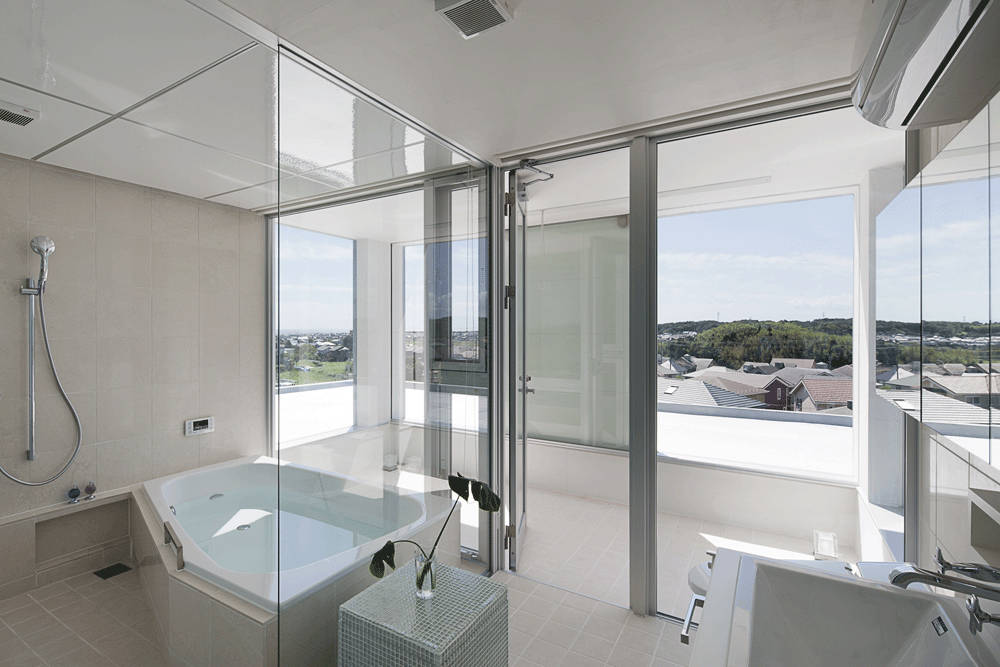 2階には、プライベート性の高い部屋を配置しました。南側の浴室では、バスタブの中から遠くの風景をのぞむことが出来ます。
