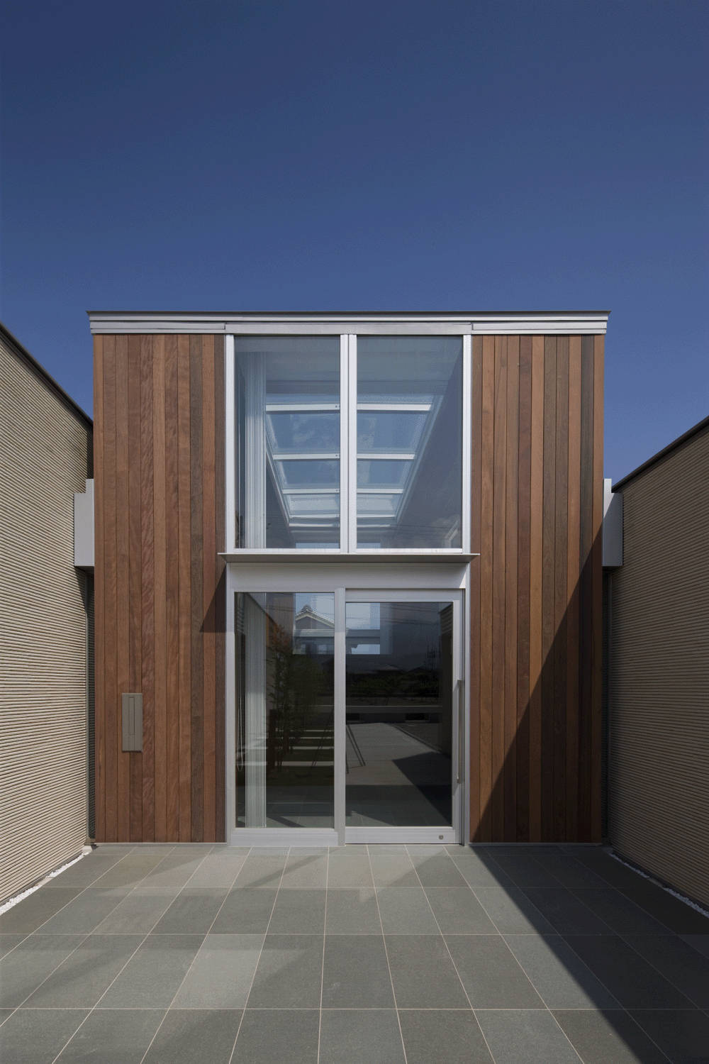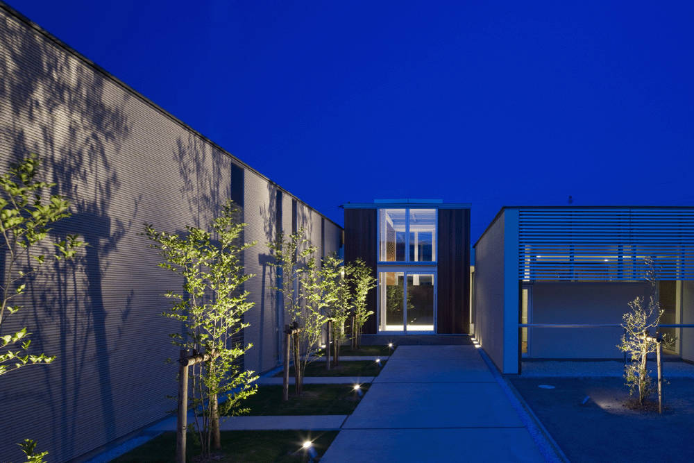 ほぼ平屋で梅の木のあいだに、横たわるようなたたずまい。広い敷地に、おおらかな自然環境であるがゆえに、内外共にゆったりとした空間がふさわしい。太陽や空、山々などのすばらしい自然を味わいながら、気持ちよく生活できる住まいです。