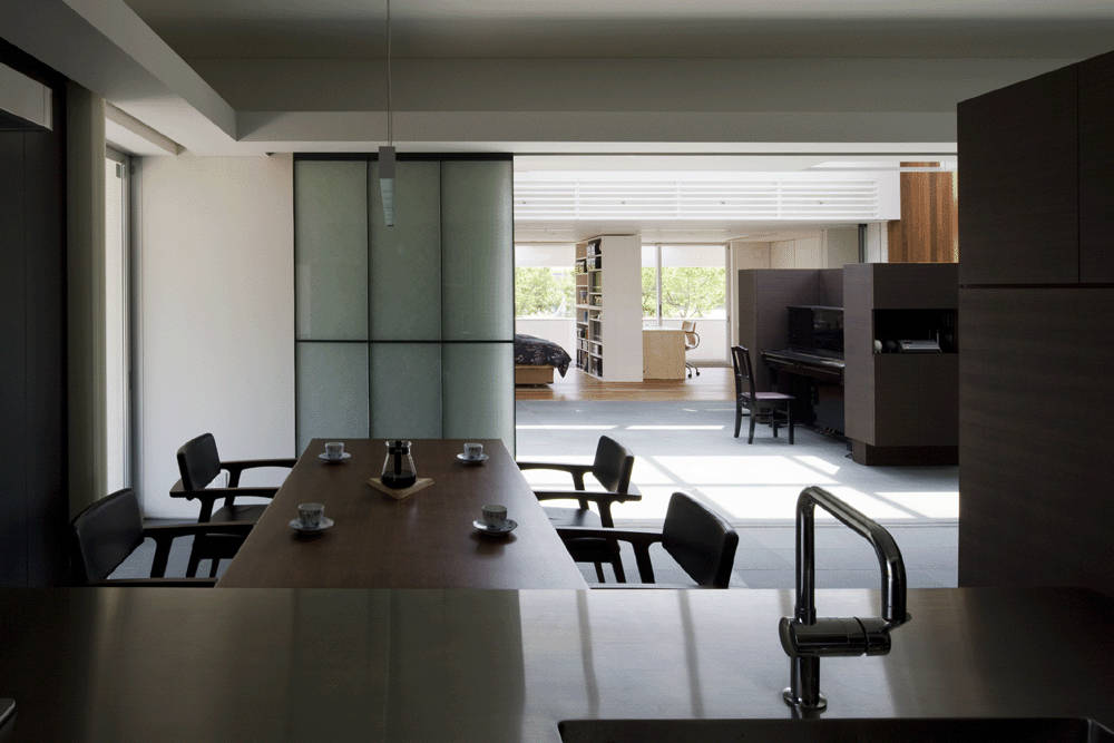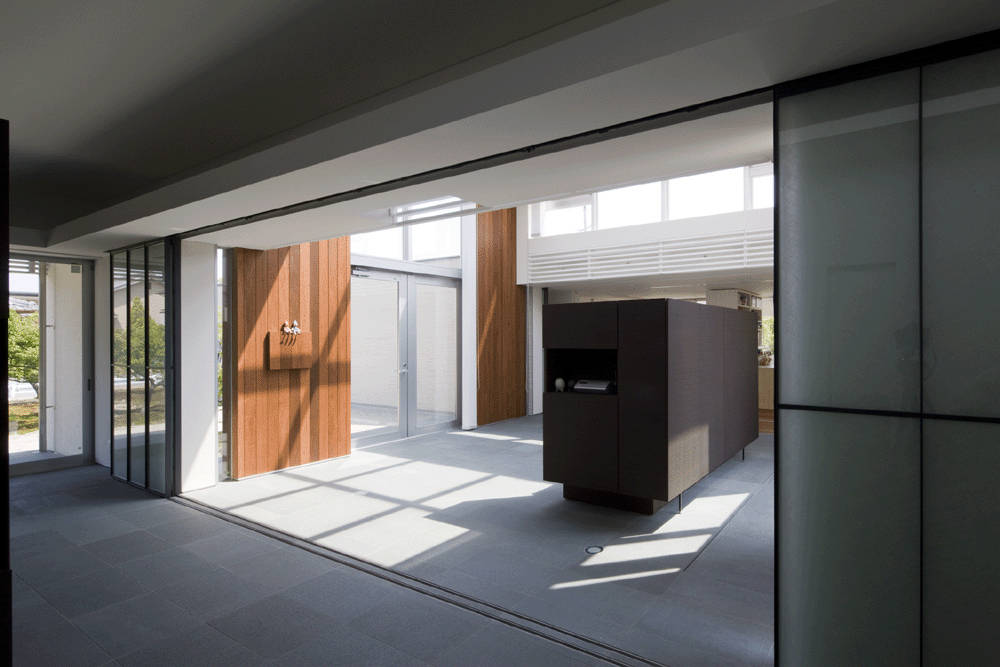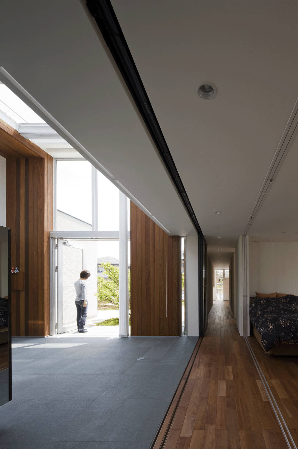 冬期は玄関(サンルーム)のトップライトで、太陽の恵みを十分受け取ります。そのあたたかい空気を、建具の開放により南北のエリアに分配します。