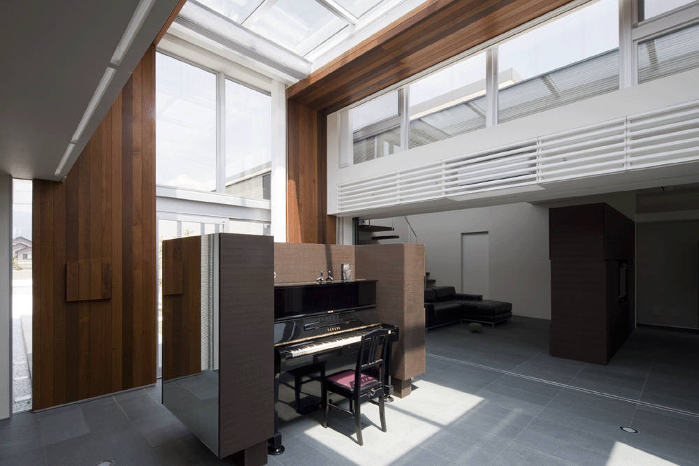 夏期は玄関(サンルーム)のハイサイドライトを開けると、そこが換気塔になり建物全体の自然換気が行なわれます。床面全体に土壌蓄熱式輻射床暖房をほどこし、建物全体の温度を一定に保ちます。さらに温熱効果を高めるため、屋根、外壁に高性能の外断熱工法と開口部にペアガラスを施工しました。