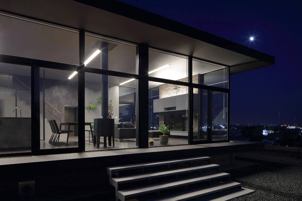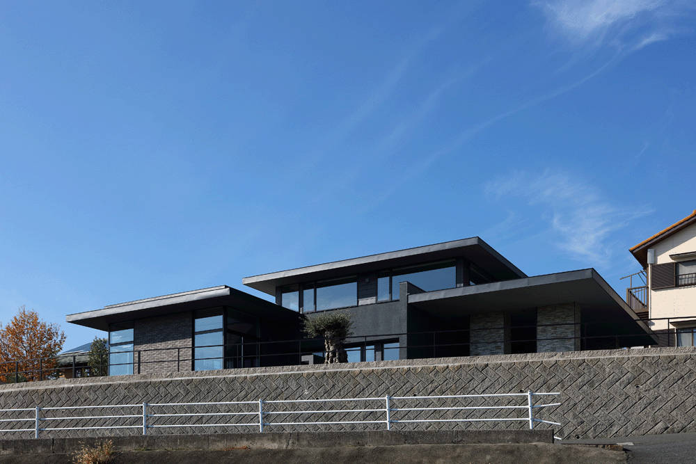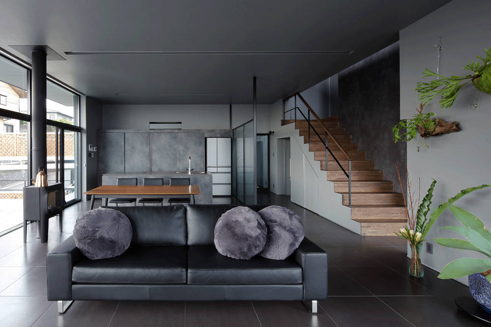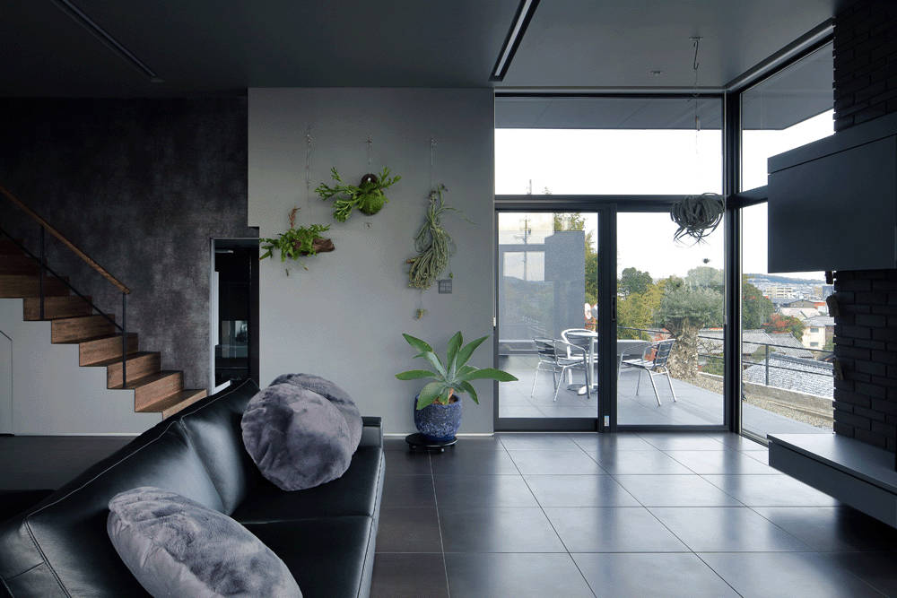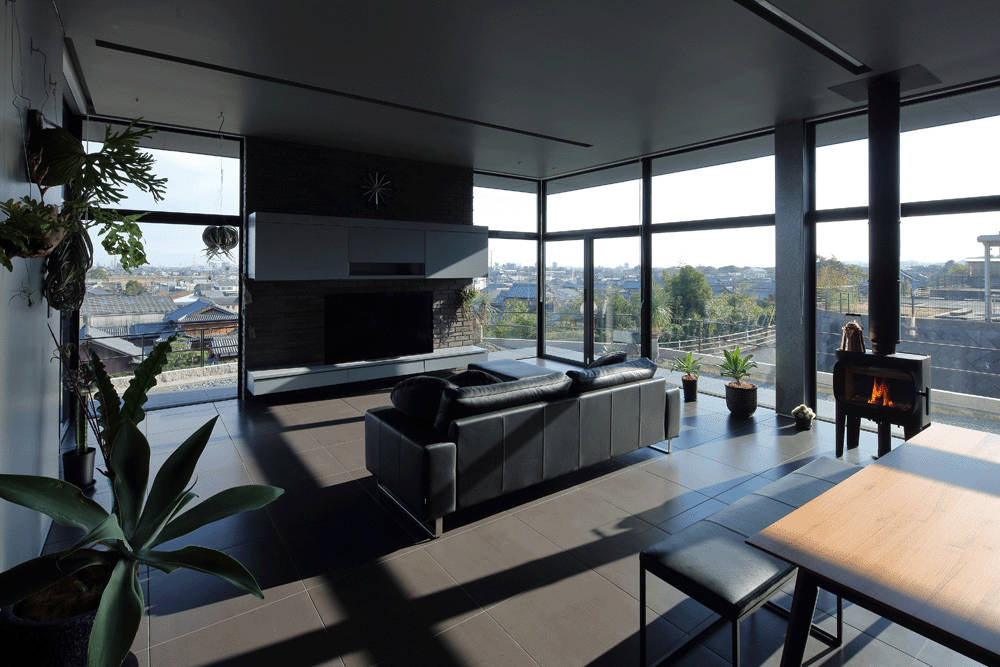 そして黒い大きな鉄の引き戸を開け建物に入ります。自然光を控え目にしたホールをまっすぐ進み、ステップを3段上がるとリビングに到達します。そのリビング左側の大きな開口部ごしに、四日市中心部の街並みを一望することができます。リビングをぐるっと取り囲む大きな開口部は、高台に住む開放感を獲得しています。ここでは、日々のあわただしさから遠ざかり、ゆったりと時間をすごす優雅な生活を送ることができます。