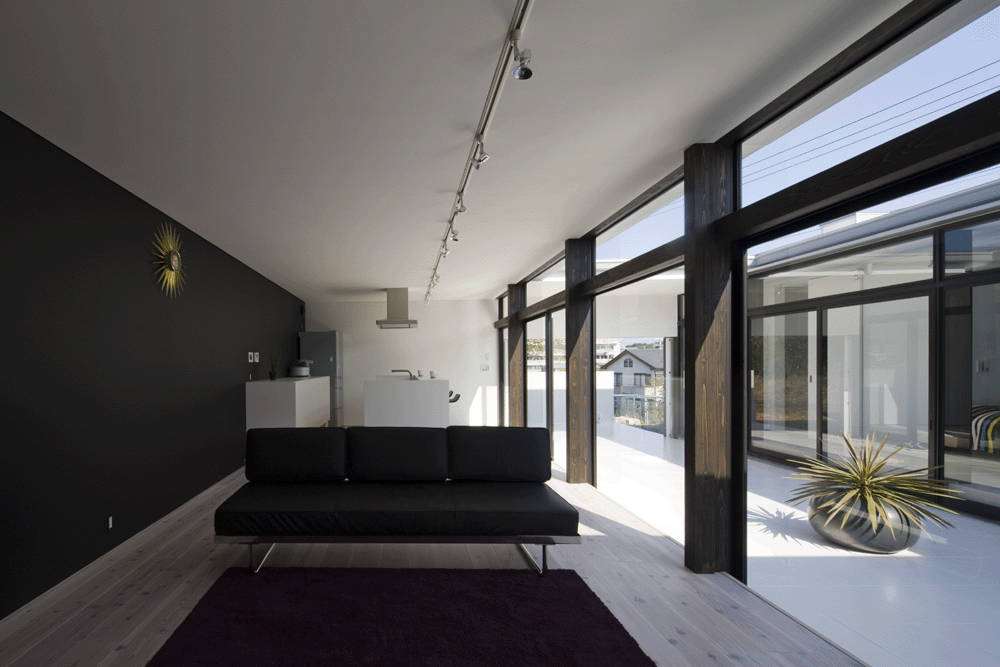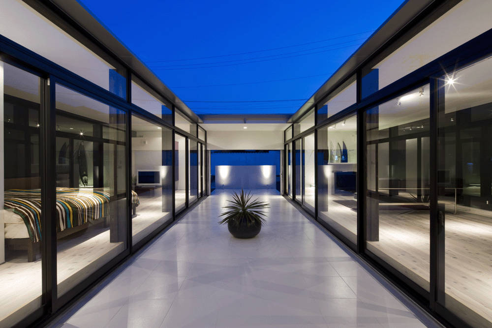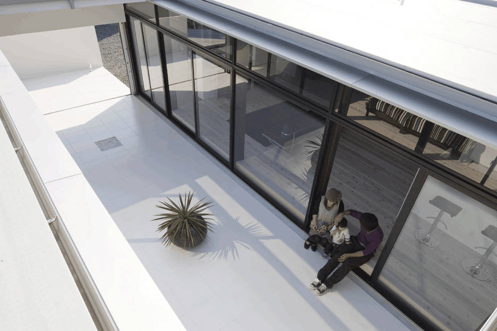 さらに採光や通風の取り入れも同時におこない、中庭に差し込んだ光は反射光となり、各部屋を明るくします。中庭の南面と北面にある出入り口を開放すれば南からさわやかな風が入り込みます。そして台風時には、その出入り口を閉じれば、建物外壁周りをしっかりガードして安心です。