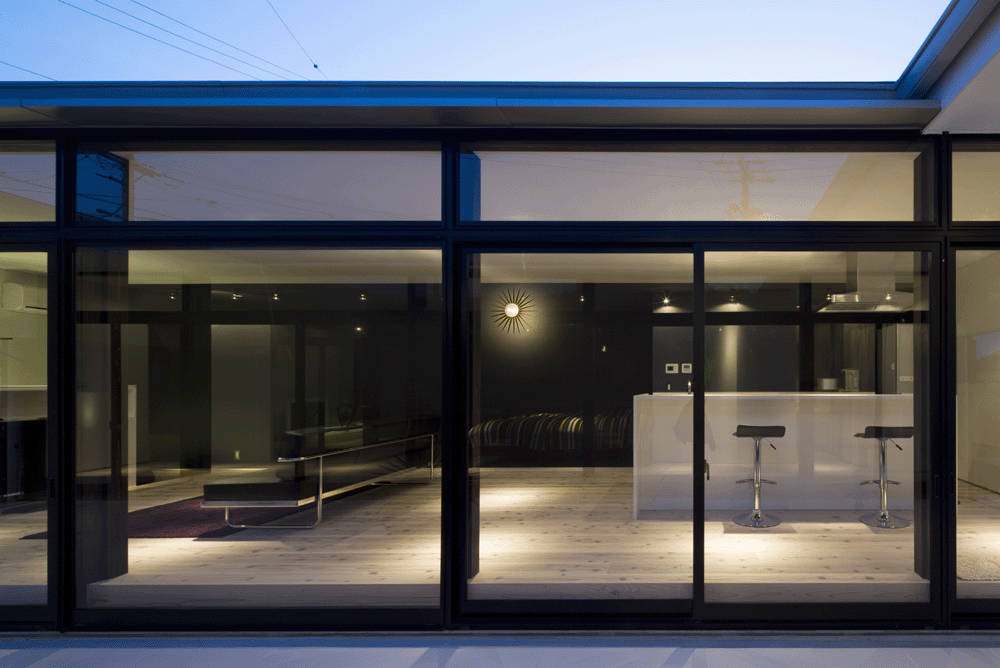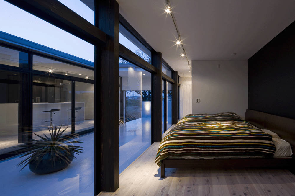 生活スタイルから平屋建てがよく、建築コスト面から出来るだけ間仕切りの少ない1ルームプランが考えられます。そして家の中心に中庭を設けました。ここは外部と内部をつなぐと共に、日常生活動線になります。