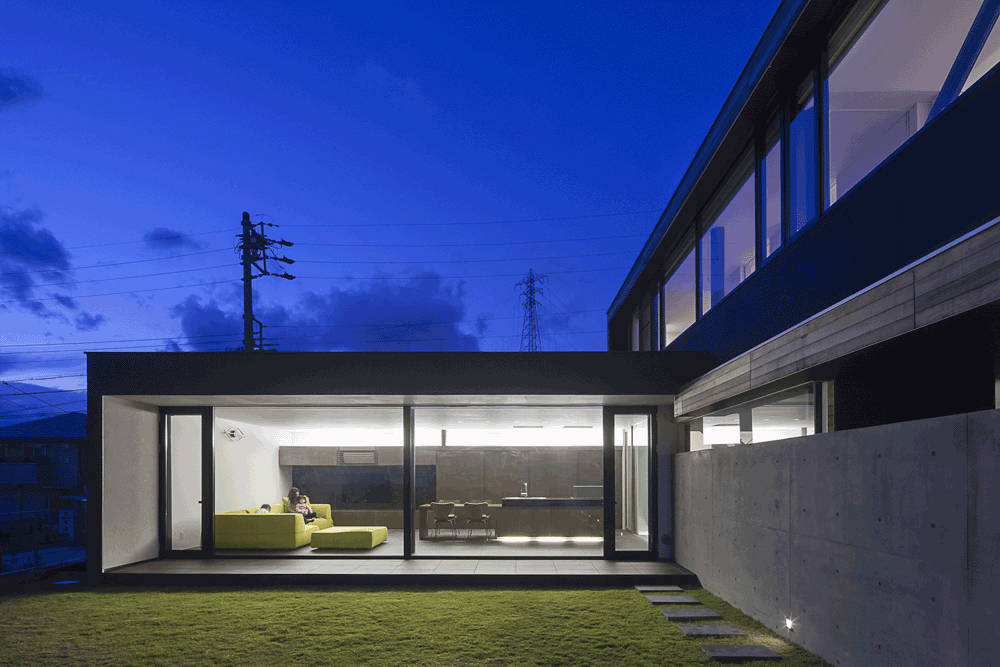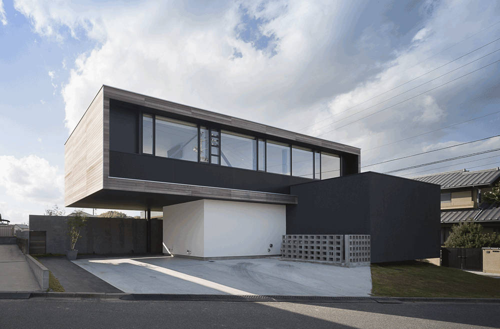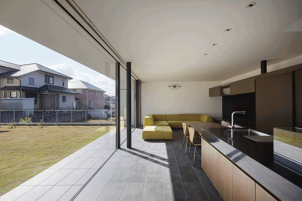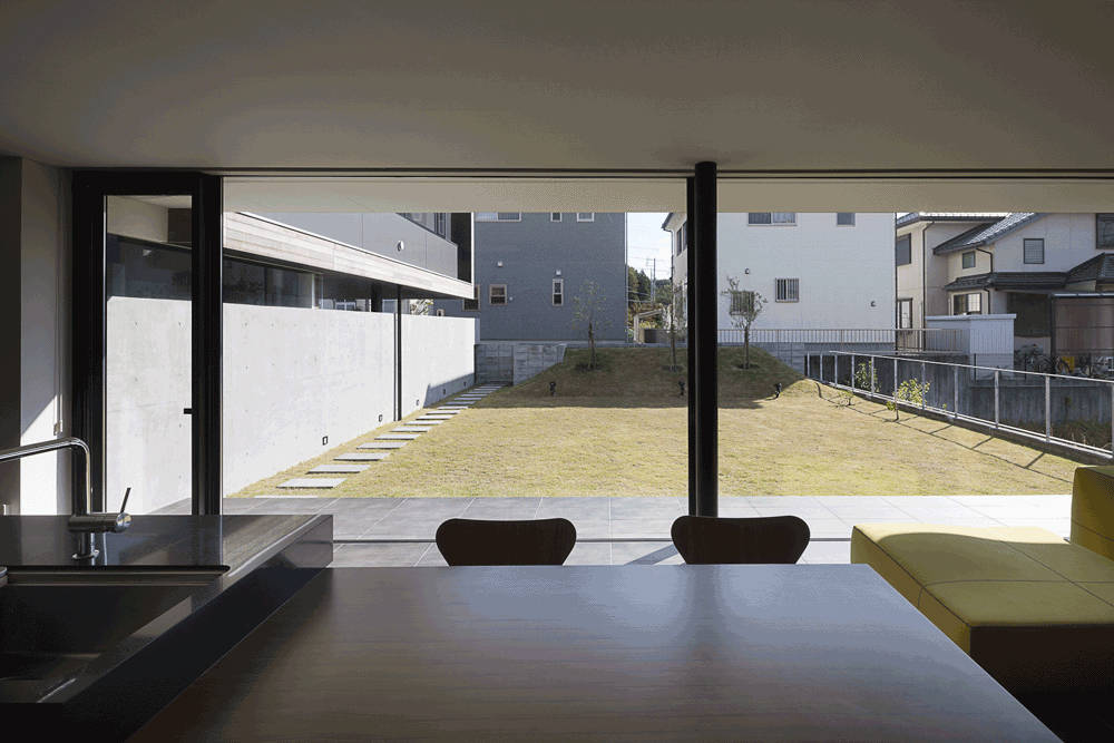 そこが駐車スペースと玄関アプローチになりました。リビングや水廻りは、敷地の北側に法面からせり出すように黒いボックスに入れまた。その南側は天井いっぱいの開口を設け、太陽の光を取り入れるとともに、芝生庭と一体とし、四季折々の変化を味わえるようにしつらえました。