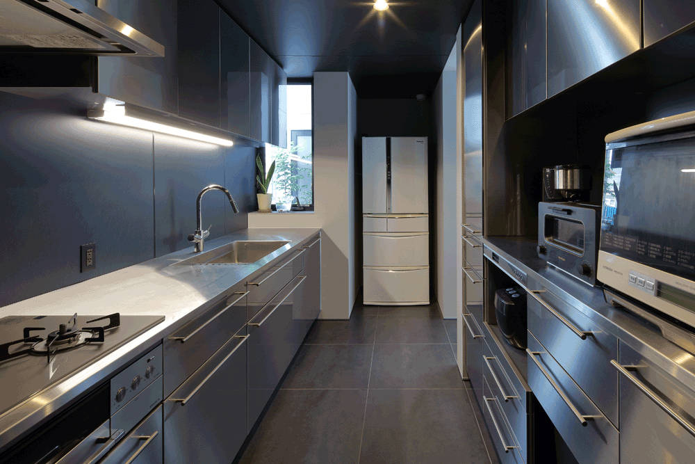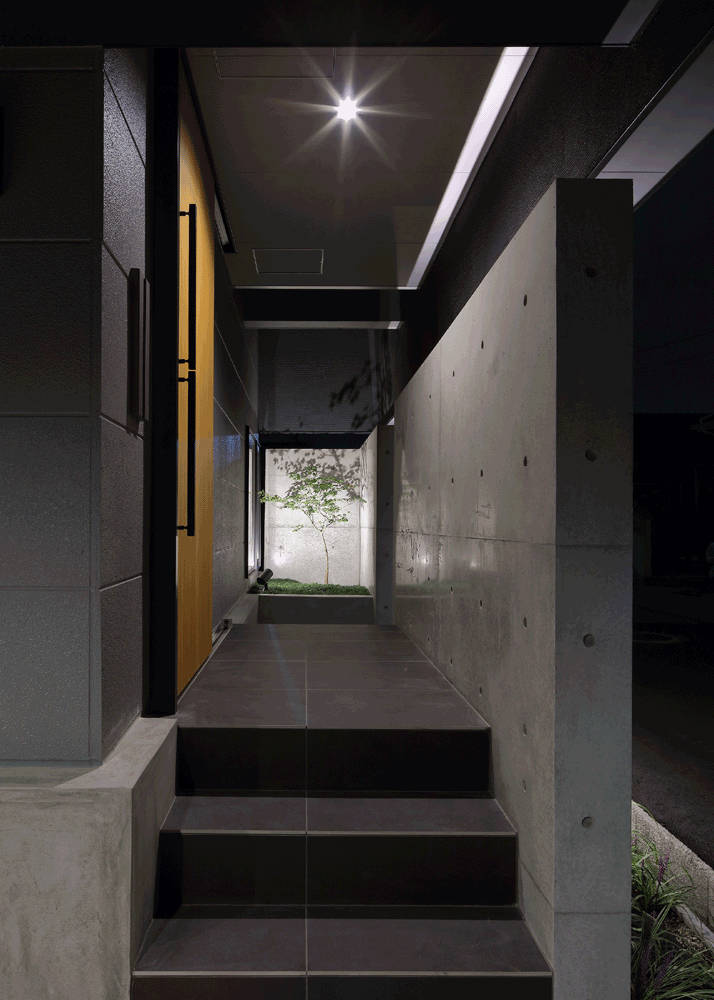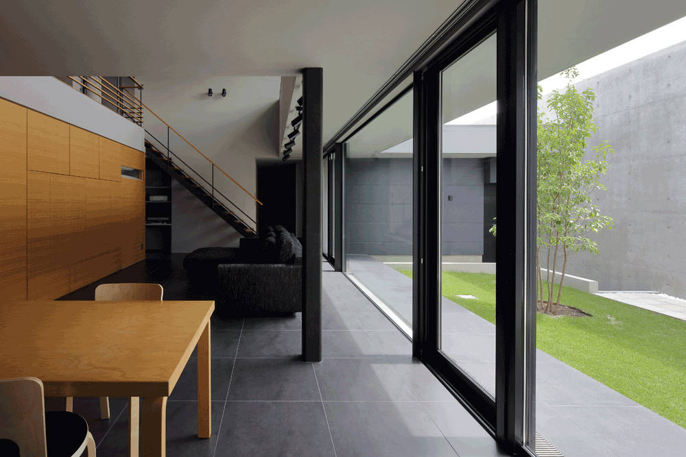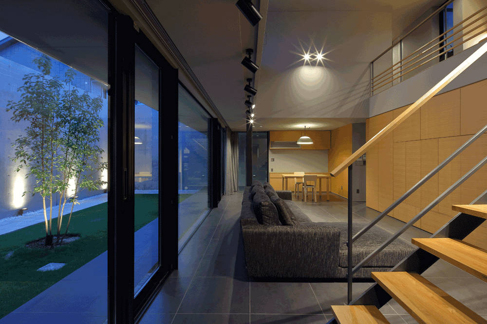 L型プランの鉄骨造住宅と、高さ4.6mのコンクリート造の塀を組み合わせ中庭を作りました。リビングダイニングからテラスへと続く段差のない床と、大型ガラスサッシにより、内部と外部がつながり広い空間を感じます。「ミニマルスマート」のタイルが、コンクリート打ち放しや、木材の素地仕上げと調和し、落ち着いた趣を醸し出しています。