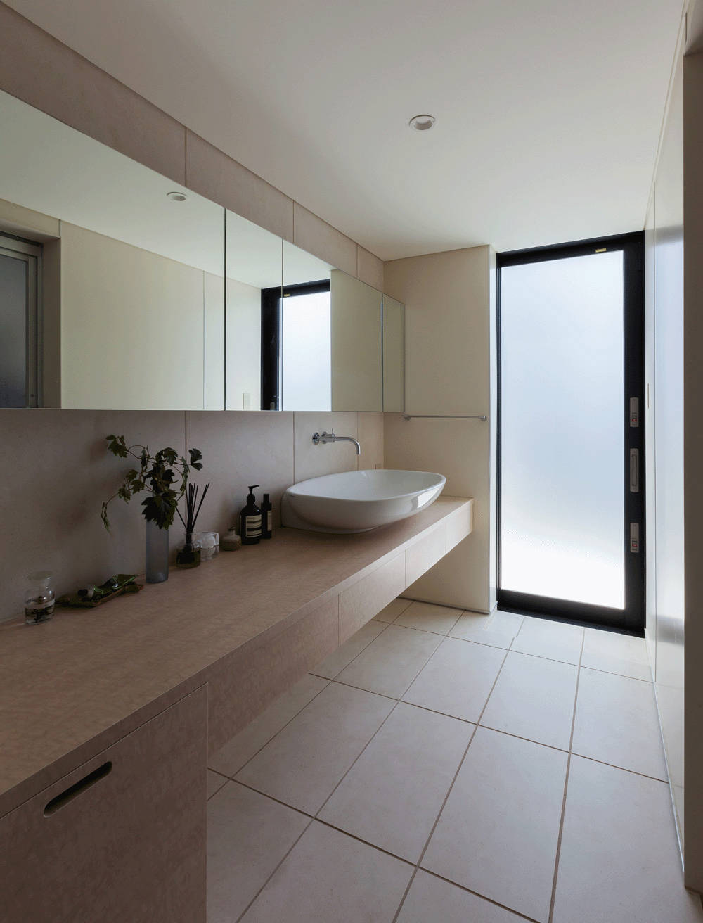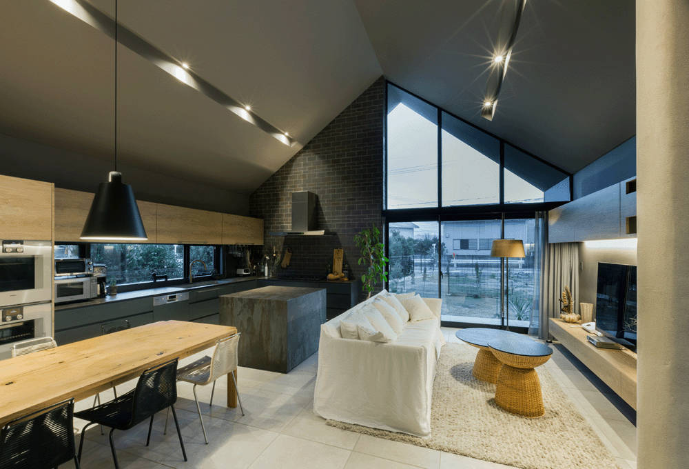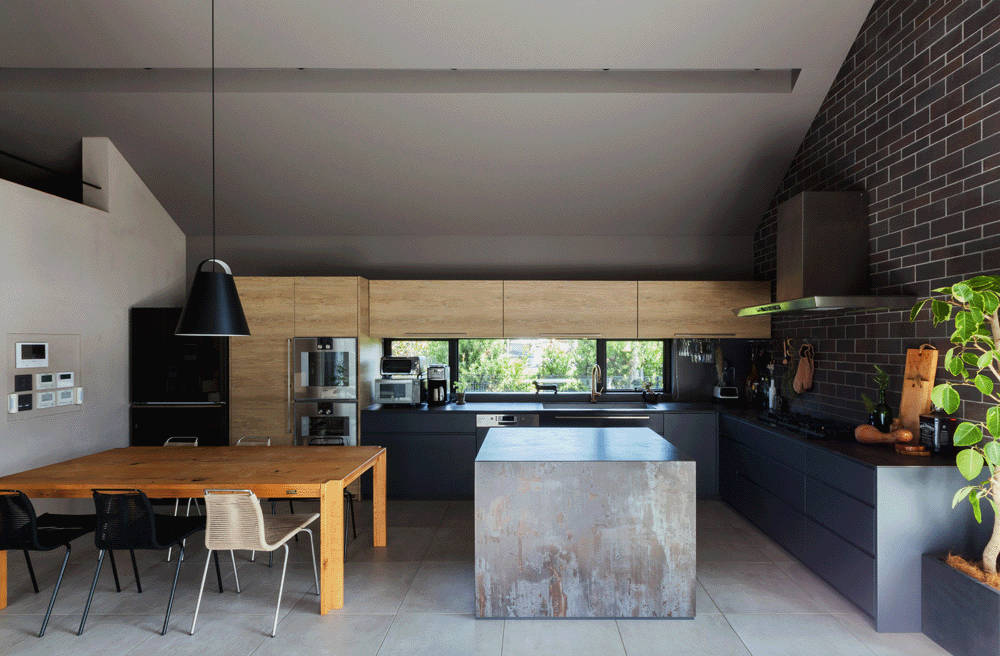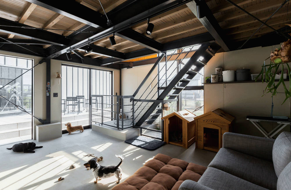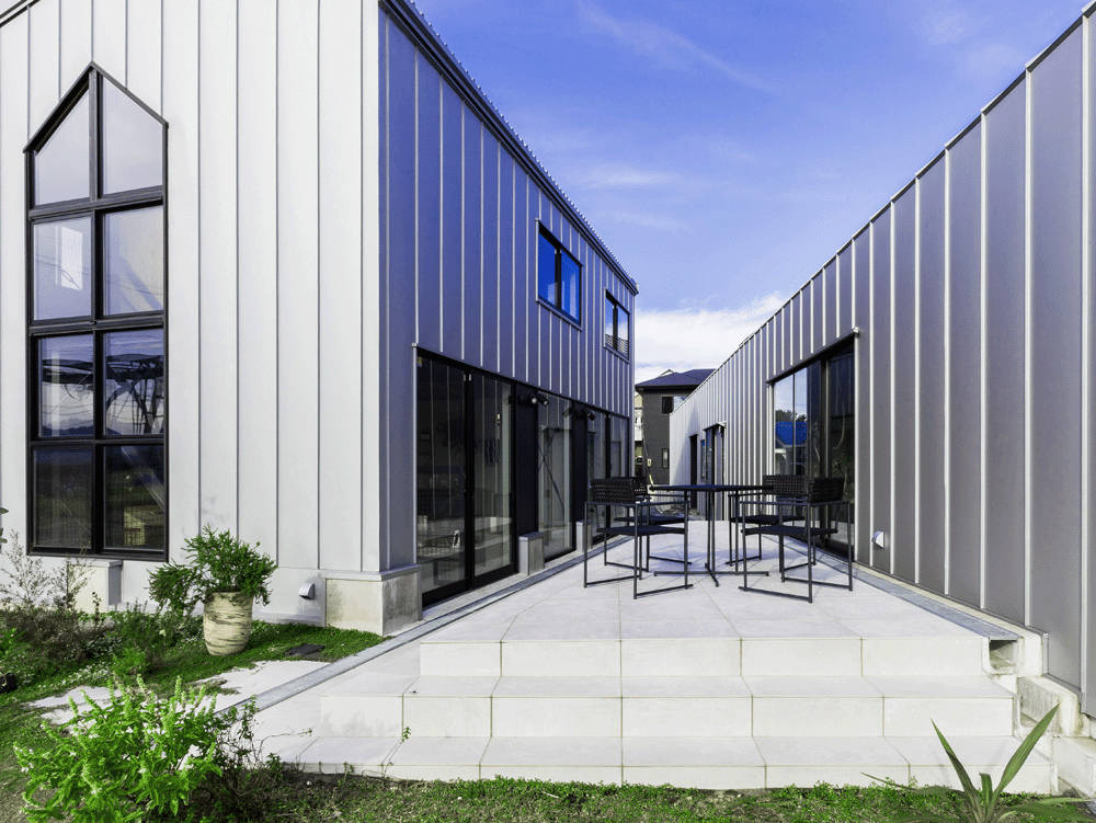 市街化調整区域で既設倉庫をリノベーションし、その東側に木造住宅を建てました。敷地北側に門と駐車スペースを設け、日常のアプローチ空間にしました。そして中庭テラスから続く南側の広い庭はクラビア草のドッグランで、犬と人間が過ごす場所にしました。