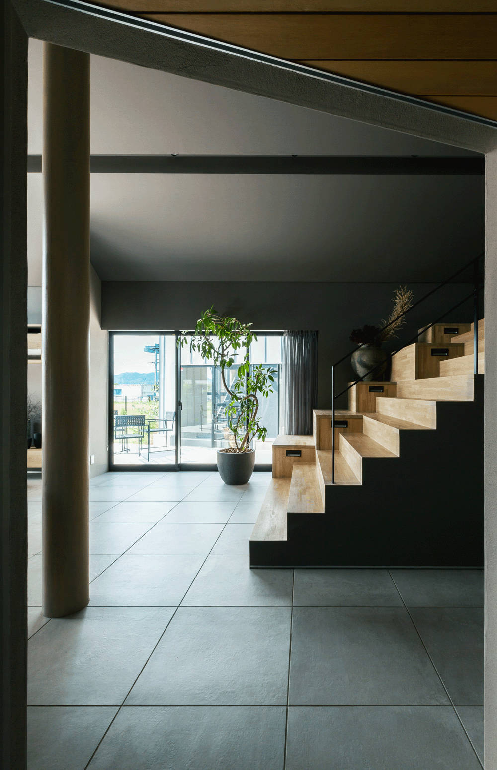外観はシンプルな三角屋根。桁行方向の長い切り妻形状は屋根と外壁を継ぎ目のない、シルバー色のガルバリウム鋼板縦ハゼで覆いました。既設倉庫も同様にし、2棟で楽しい雰囲気を作り出します。内部は切り妻屋根形状をそのまま室内空間とし、妻側に大きな開口部を設けました。建物中央の大階段が各部屋をつなぐ構成で、空間に変化を与えます。