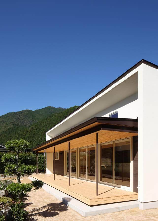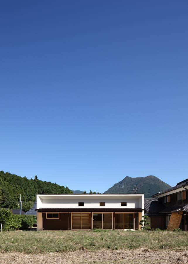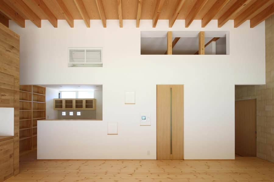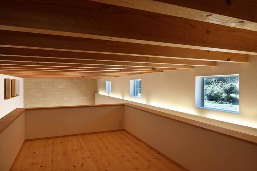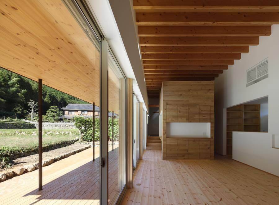 『一間』…「ひとま」ゆるく仕切られた空間は、大きな一つの空間。大きな箱の中に小さな1つの箱を挿入することで、視覚的にも緩やかに空間を区切りながら、様々な用途のスペース計画しています。暮らしの中で、この場所の四季折々のうつろいを感じ楽しむ為の場所。南の里山に大きく開いた開口部からは優しく光が届き、まるで家自体が大きな縁側かのような心地よい空間となる。