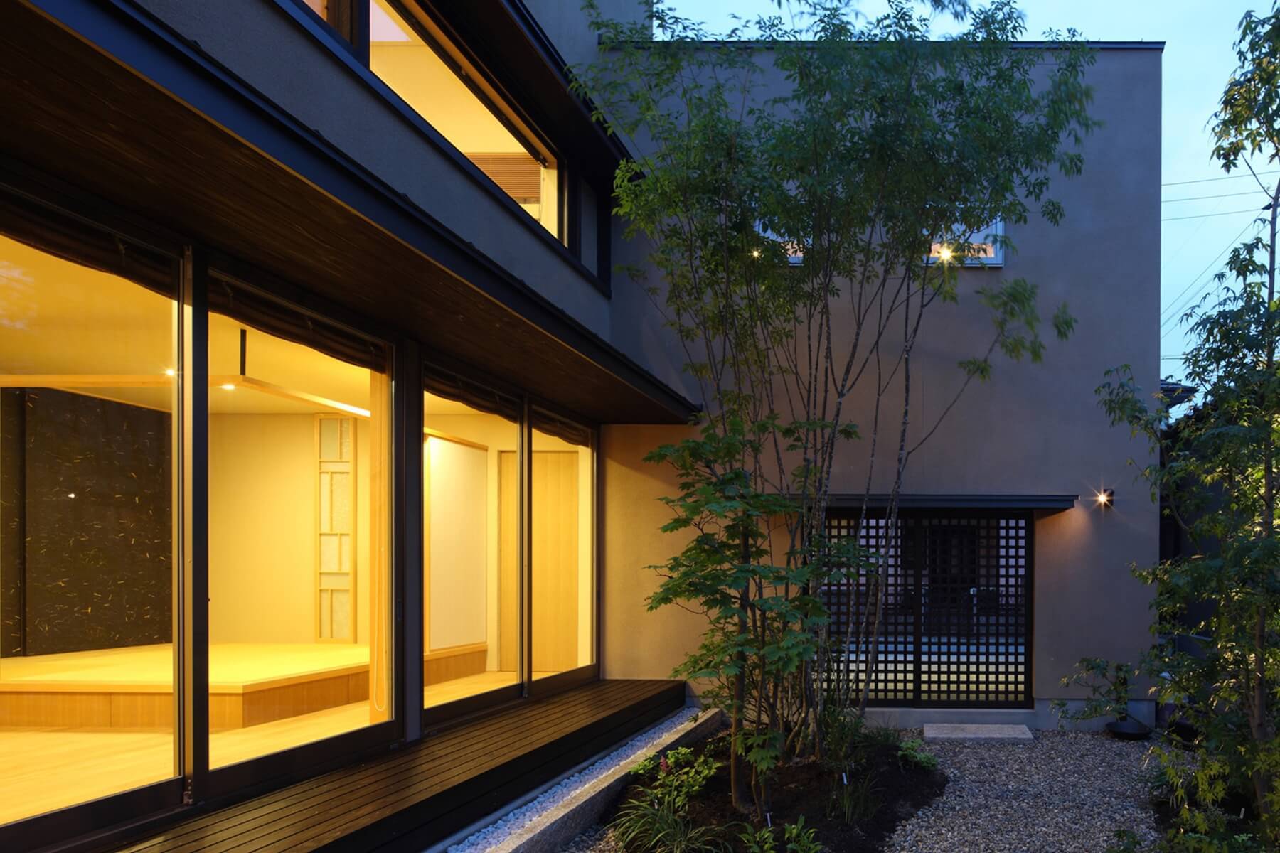 敷地に対し、閉じて開くことで、ゆったりと楽しめる庭を確保し、立体的に二つのご家族が一つの庭を共有する。