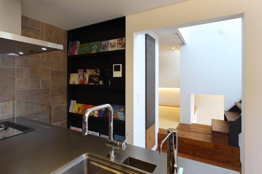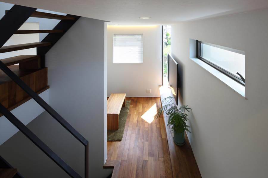 現況の敷地高低差(約2m)を利用しながら、ご家族4人+愛車1台で、楽しく暮らせる住まいの計画。約17坪の敷地の中に、7層のスキップフロアを配し、大小さまざまな居場所を設けています。