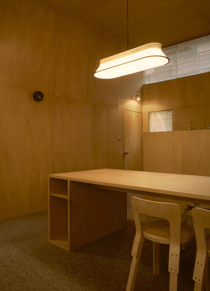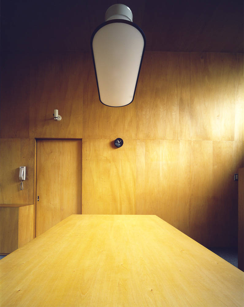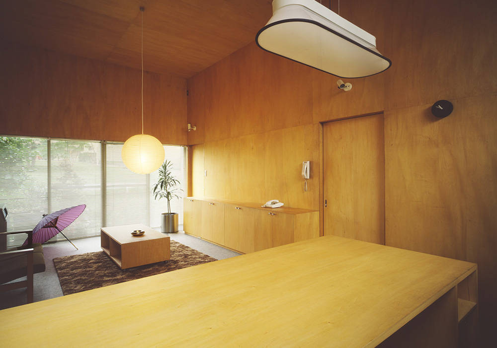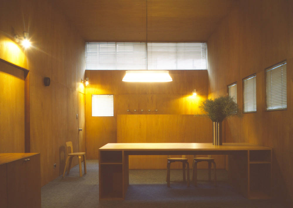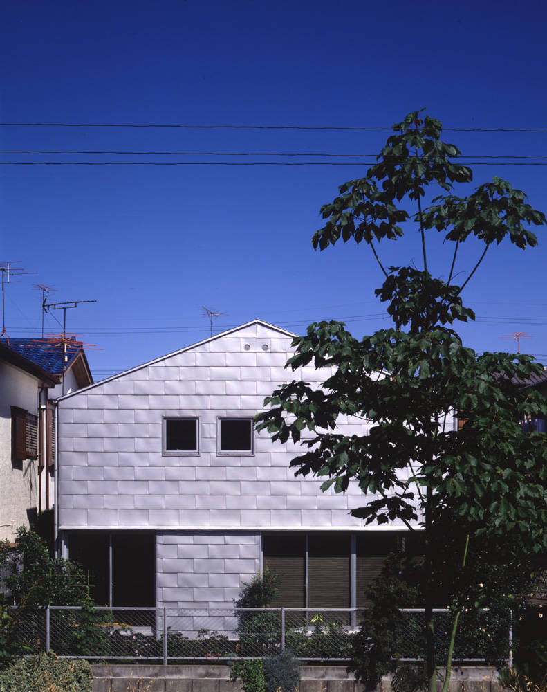 この住宅は、東京の郊外の住宅地の一角に建つローコストで計画されたました。平面計画は、単純明快な矩形でコンパクトにまとめられ、各室は吹き抜けの居間を中心に配置されています。内部の仕上げは、シナ合板とし木地を出して暖か味のある空間としました。外装は銀色の亜鉛鉄板で全体を覆い、アイデンティティを主張した家となっています。