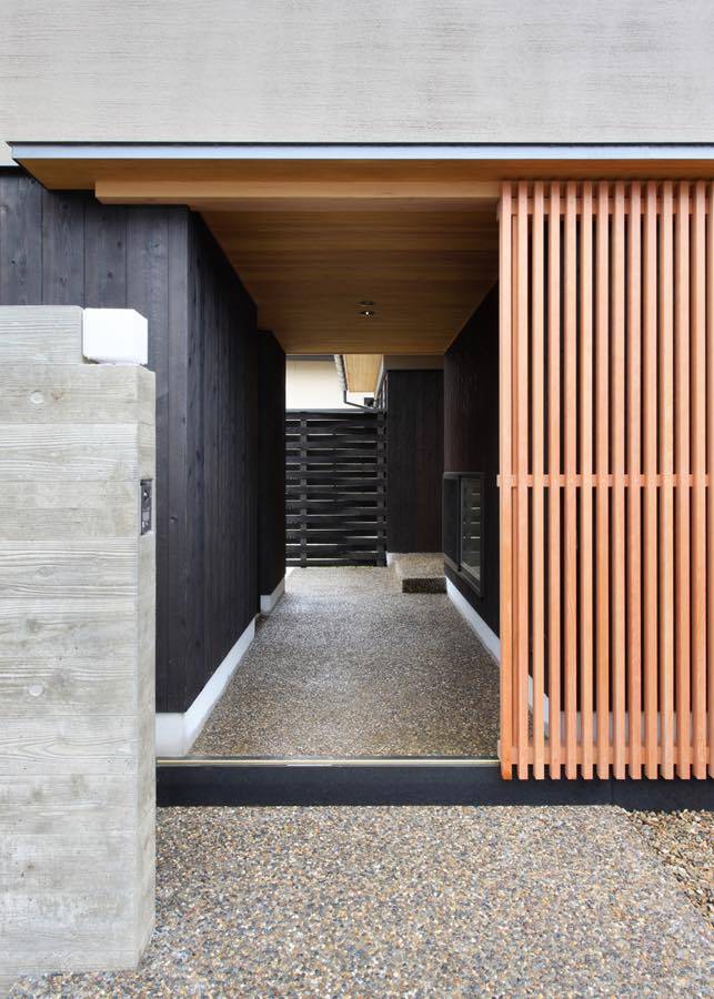 格子戸を開き、やや暗がりの「通り土間」を奥へと進むと、通り抜けた先には中庭が広がっており、そこまで進むと玄関が姿を表す・・・玄関を開けると土間越しの路地庭が、外へ・・・と視線を誘う。戸を開け放すと、1階のスペースは土間と一体となる。休日は、釣り竿の手入れを楽しんだりもする、内と外を楽しむ空間。