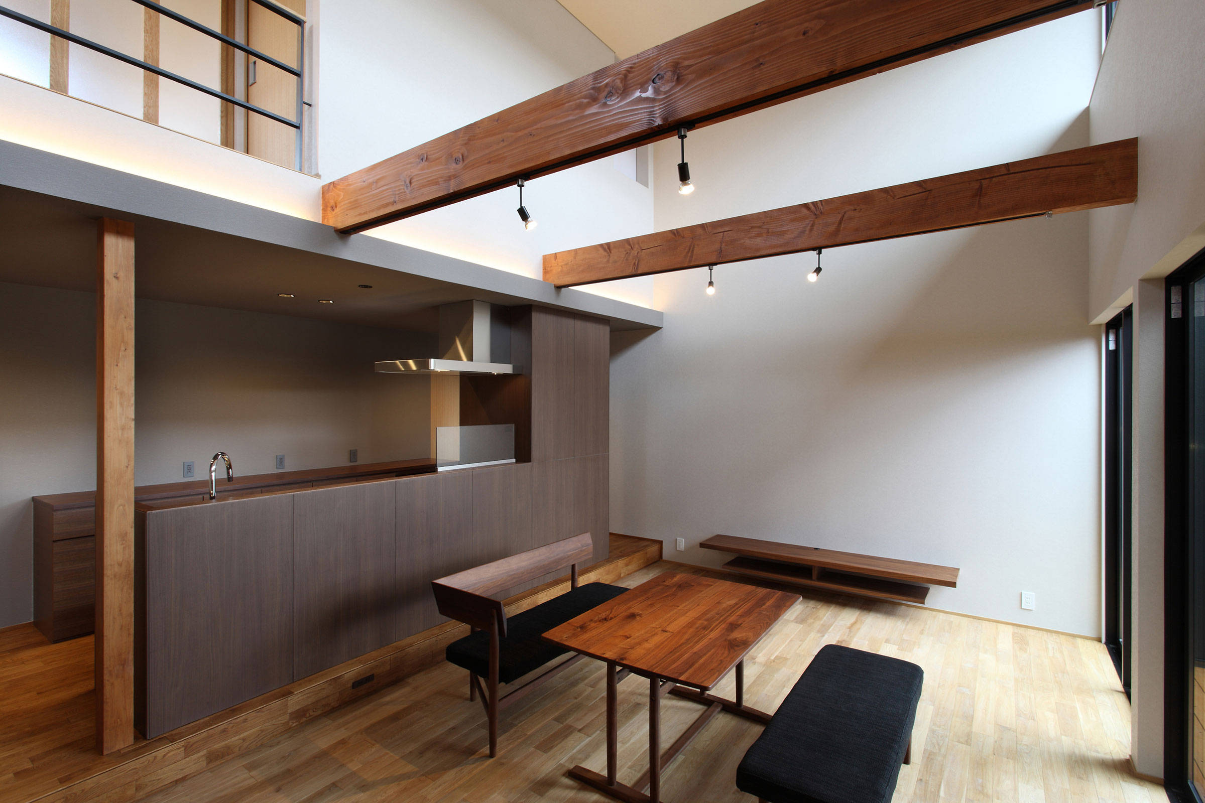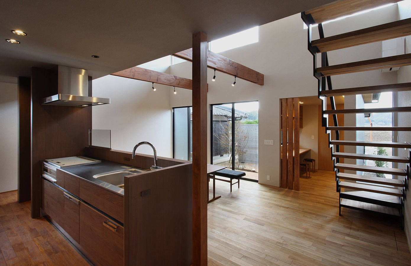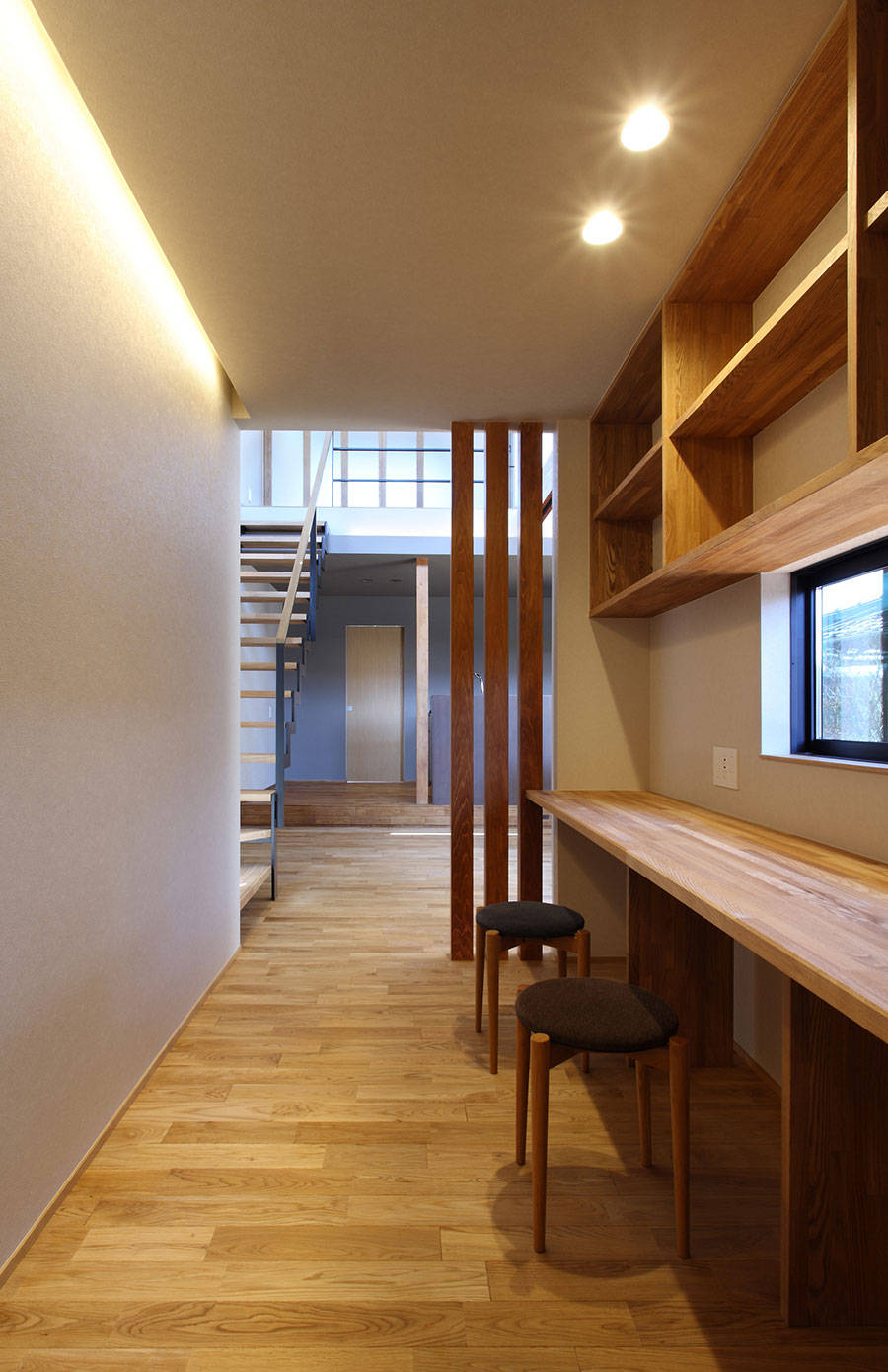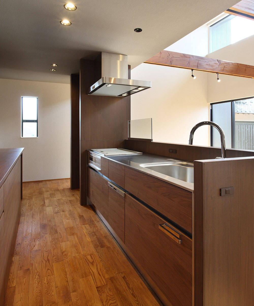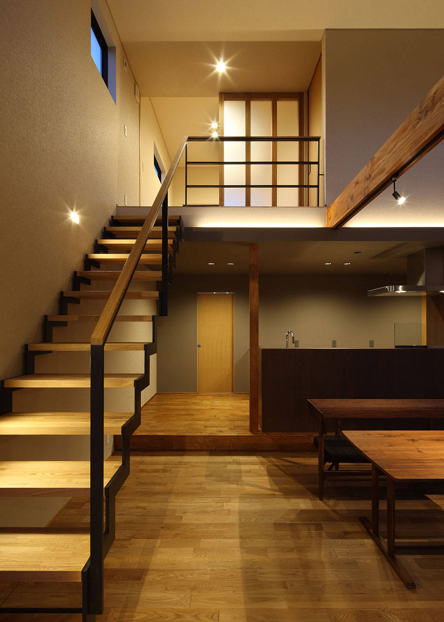 「視線」「眺望」「採光」「通風」等のそれぞれの要素に配慮し、ご実家側とは繋がりながら、見通しの良い周辺環境に対しては緩やかに閉じる。そして、この地ならではの故郷の風景を豊かに感じることできる住まい。元々、田畑の時にあった敷地高低差をそのまま建物内部へと取込み、奥へと進むごとに床レベルを変化させていくことで、細長い敷地に建つ『風景の舎』の内部空間に様々な表情を持たせています。