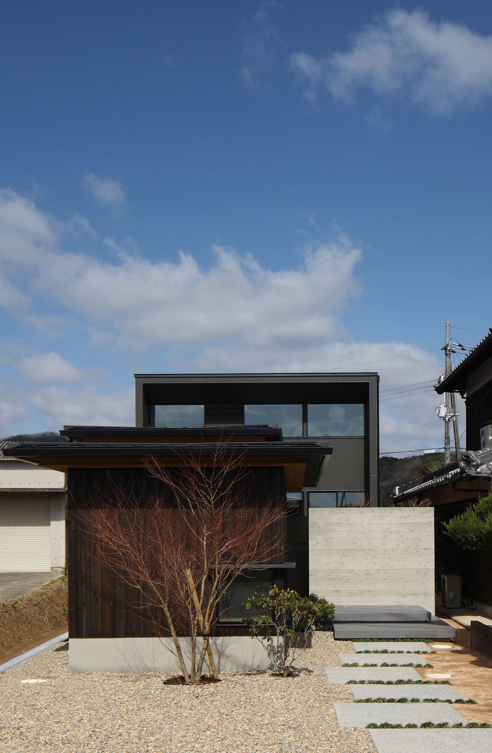 市街化調整区域内に建つご実家に隣接する敷地。田園風景の向こうに広がる山並み、この自然豊かな環境を新居の計画地に選ばれたクライアントご夫妻。懐かしい風景の中に建つこの家は、敷地 間口7m余り、奥行30mのとても細長く高低差ある敷地でした。この地の良さを活かしながら、周辺との程よい距離感を模索するところから、家づくりは始まりました。