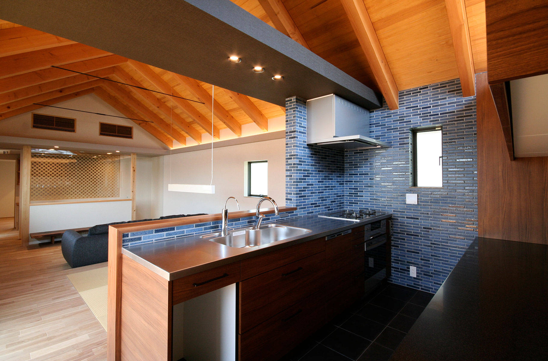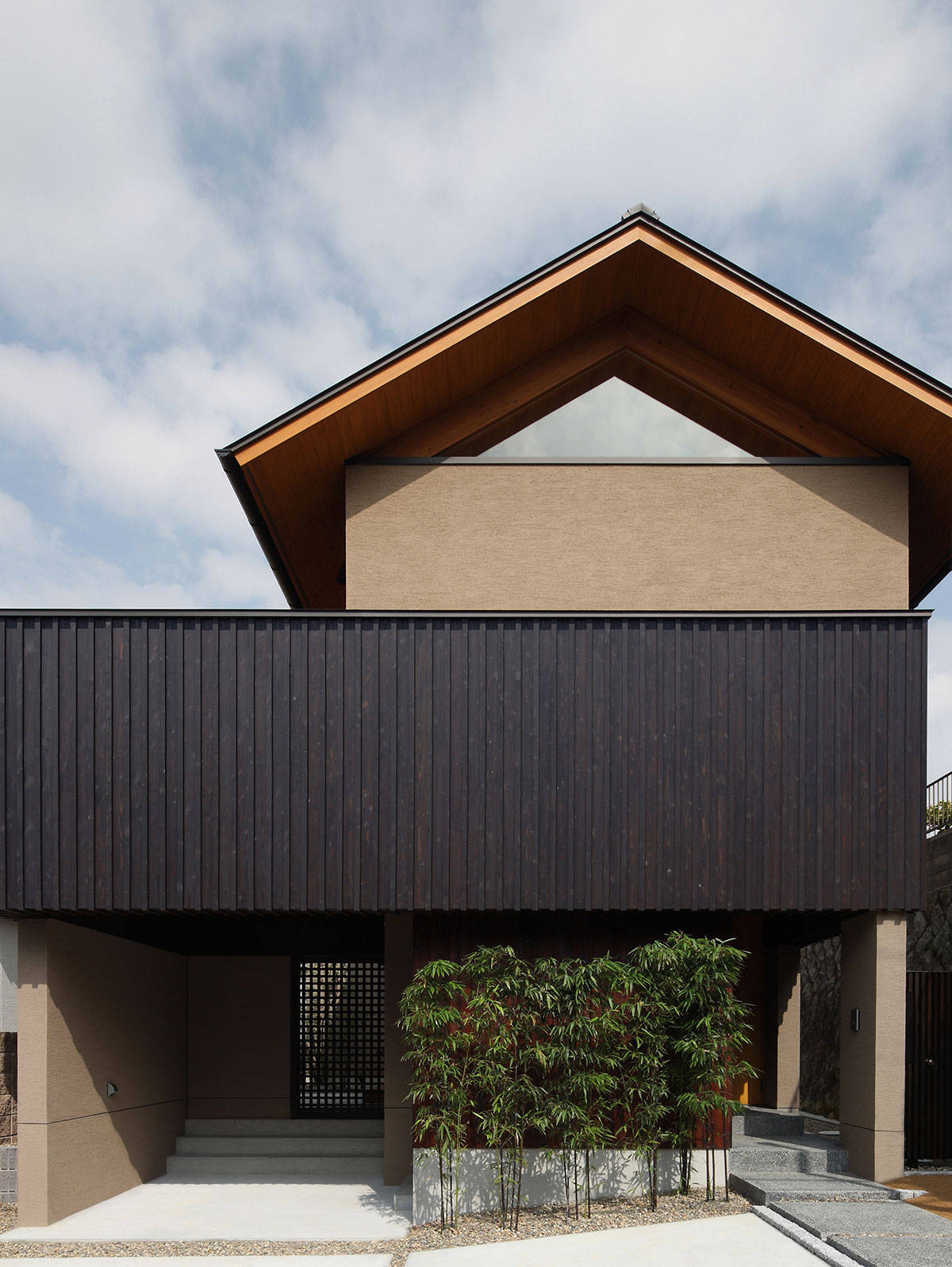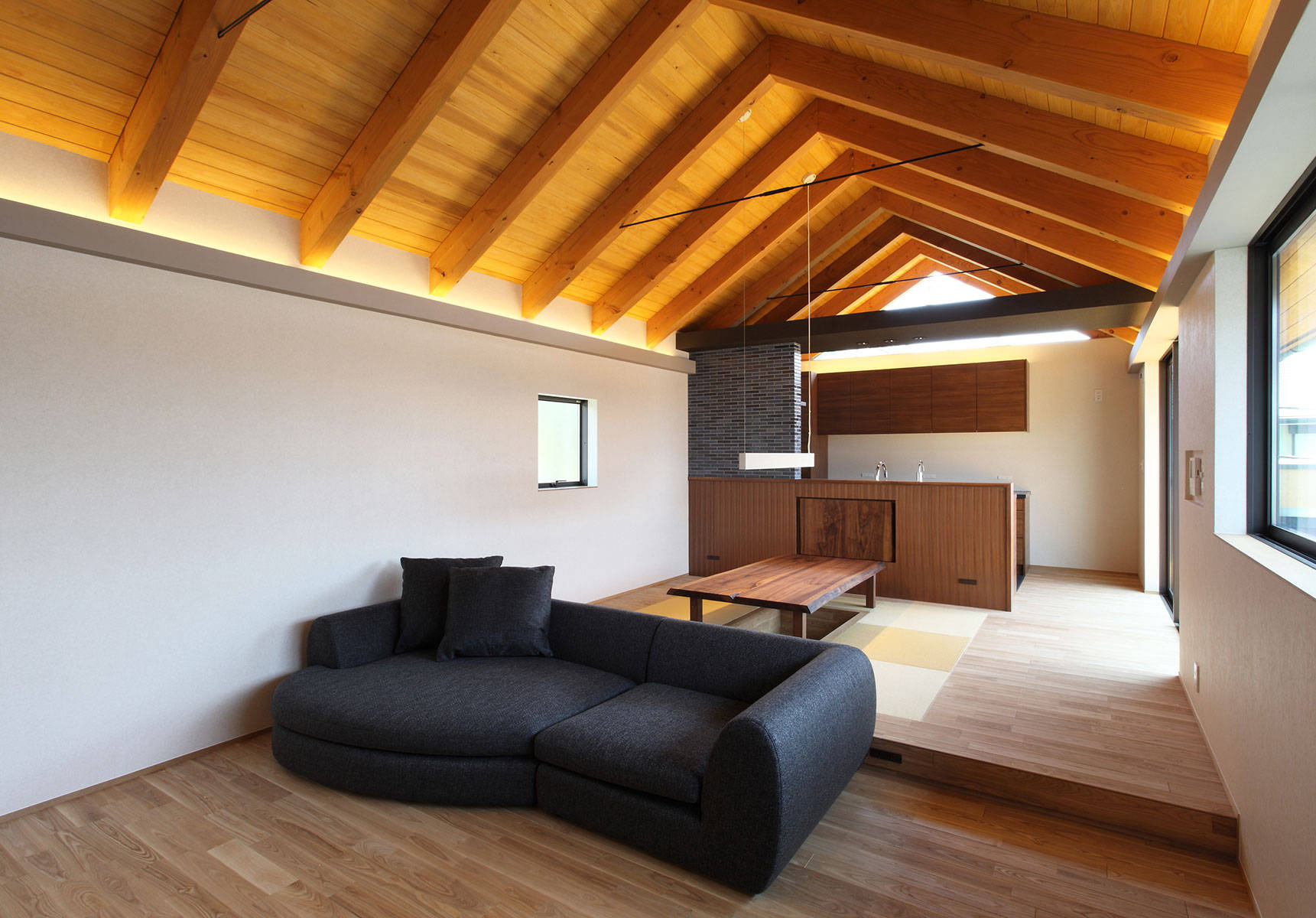 敷地は人気エリアの住宅街の一角。海からの風を感じ、街並みの向こう空に浮かぶ明石海峡大橋が望めるロケーション。ご夫妻の趣味はサーフィン・スノーボード、日々の過ごし方、休日の過ごし方・・・と生活スタイルのヒアリングを繰り返し、『趣味を楽しみながら、日々の暮らしも心地良く』を形にした住宅です。懐かしさのある和の趣きを取入れ、影・暗がりなど陰影をデザインすることで、建て込んだ住宅地の中にありながら、美しい光を意識できる豊かな空間をご提案しました。1階の中庭では、趣味のサーフィン・スノーボードが手入れできるよう車庫からのスムーズな動線を確保し動線上には、趣味の道具を保管できる倉庫を配しています。2階をリビングとし床座の居間としたことで開けた景色を獲得しながら、座った目線では空へと開けるゆったりとした空間が家族の居場所となっています。構造的には、法的な高さ規制をクリアするために、一部に接合工法を採用しており、山型フレームが連続する象徴的な空間が展開する建物となっています。
