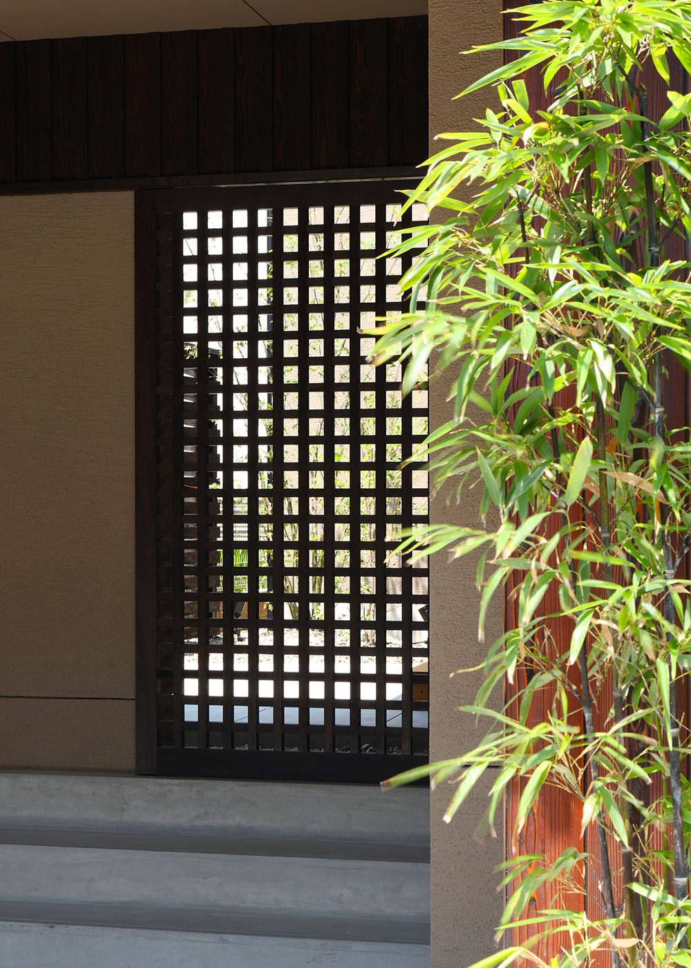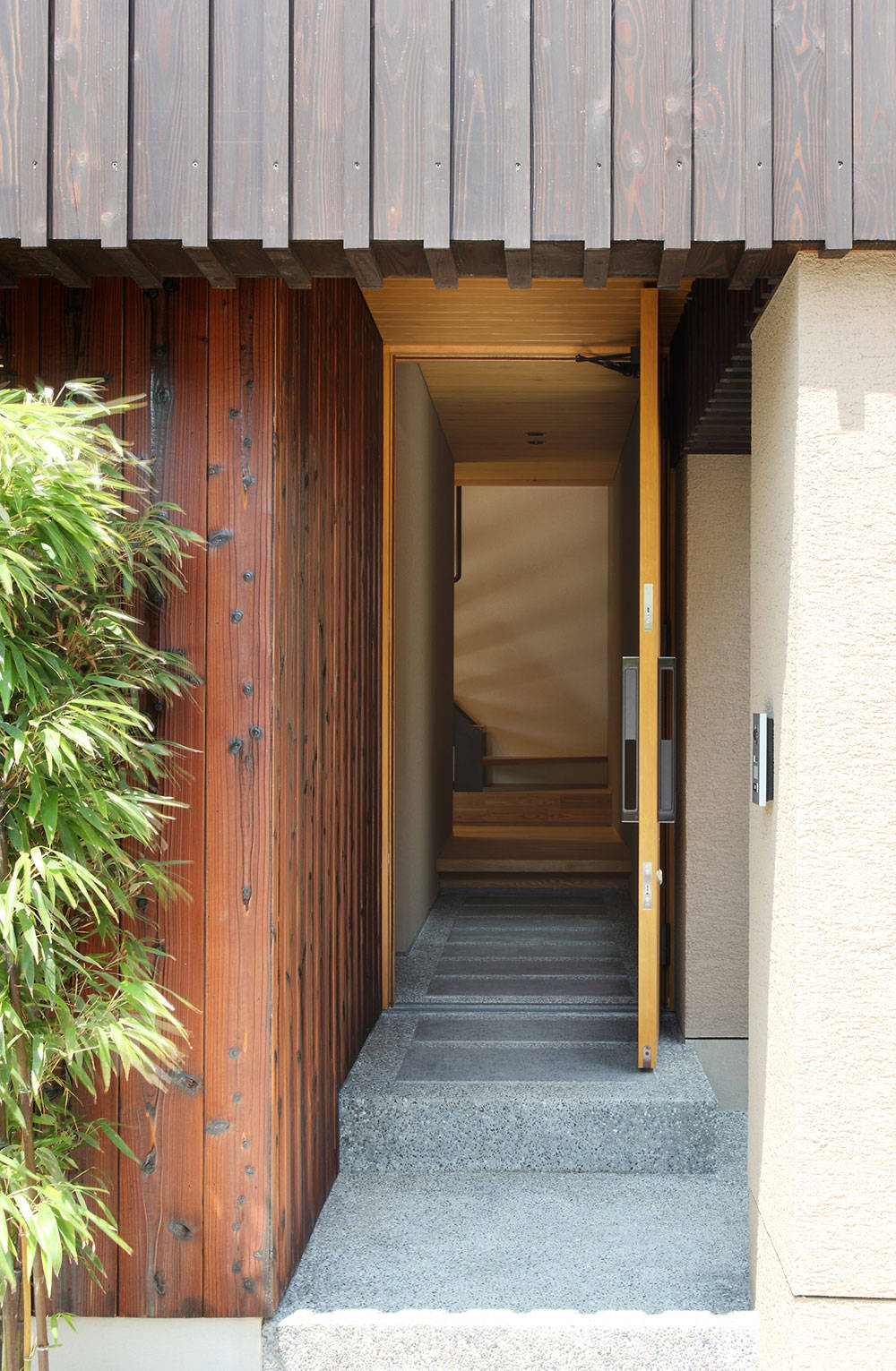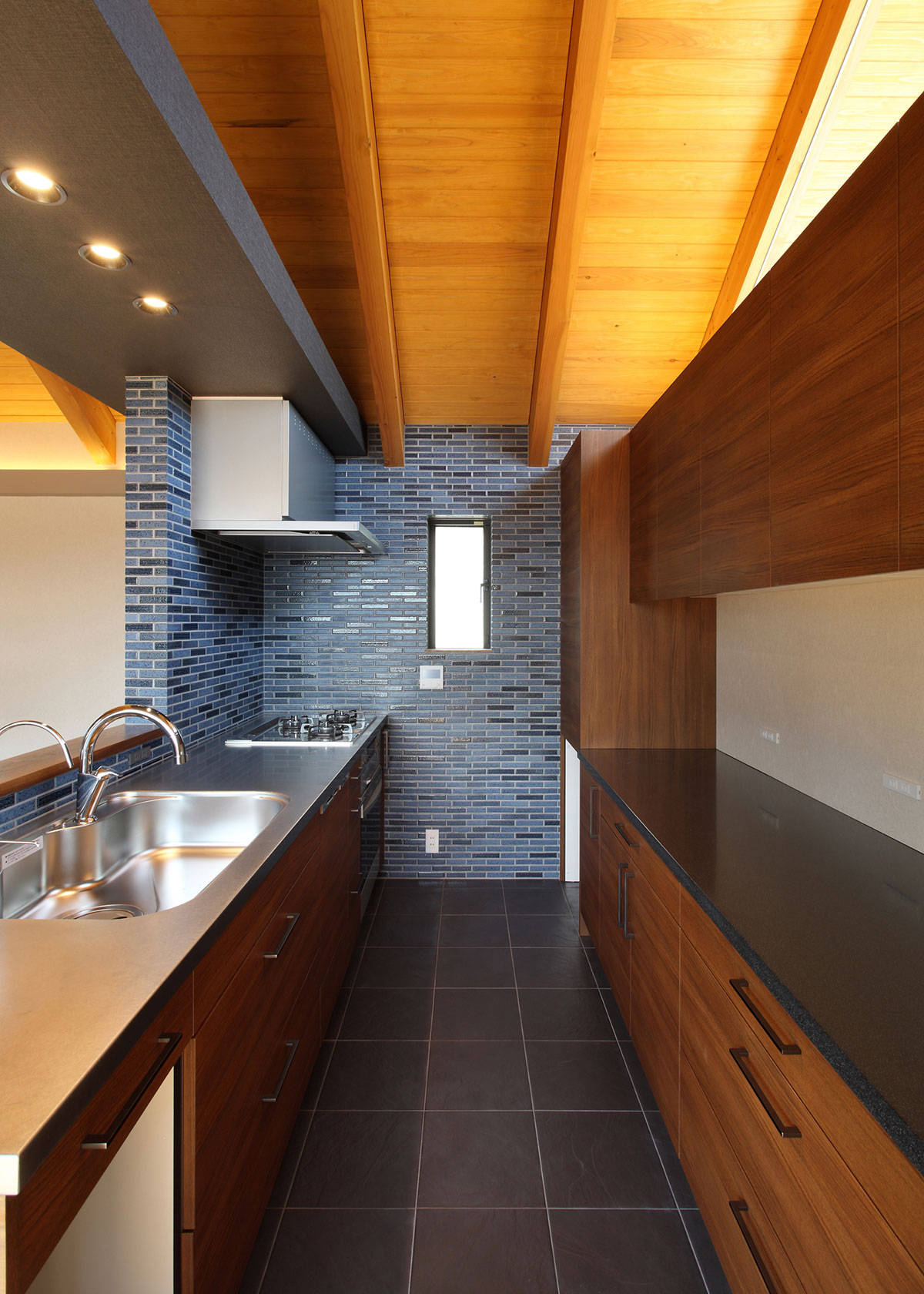 敷地は人気エリアの住宅街の一角。海からの風を感じ、街並みの向こう空に浮かぶ明石海峡大橋が望めるロケーション。ご夫妻の趣味はサーフィン・スノーボード、日々の過ごし方、休日の過ごし方・・・と生活スタイルのヒアリングを繰り返し、『趣味を楽しみながら、日々の暮らしも心地良く』を形にした住宅です。懐かしさのある和の趣きを取入れ、影・暗がりなど陰影をデザインすることで、建て込んだ住宅地の中にありながら、美しい光を意識できる豊かな空間をご提案しました。1階の中庭では、趣味のサーフィン・スノーボードが手入れできるよう車庫からのスムーズな動線を確保し動線上には、趣味の道具を保管できる倉庫を配しています。2階をリビングとし床座の居間としたことで開けた景色を獲得しながら、座った目線では空へと開けるゆったりとした空間が家族の居場所となっています。構造的には、法的な高さ規制をクリアするために、一部に接合工法を採用しており、山型フレームが連続する象徴的な空間が展開する建物となっています。