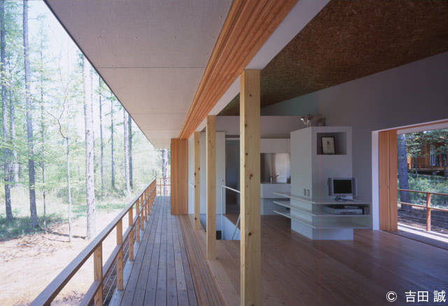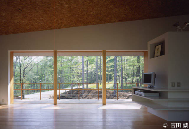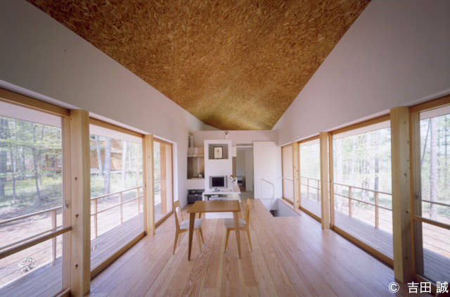 セカンドハウスは大きな一体の屋根に包まれたワンルーム。両サイドに大きな開口とバルコニーを設け、広葉樹と針葉樹の森の中に浮かぶクライントの拠点ができました。
