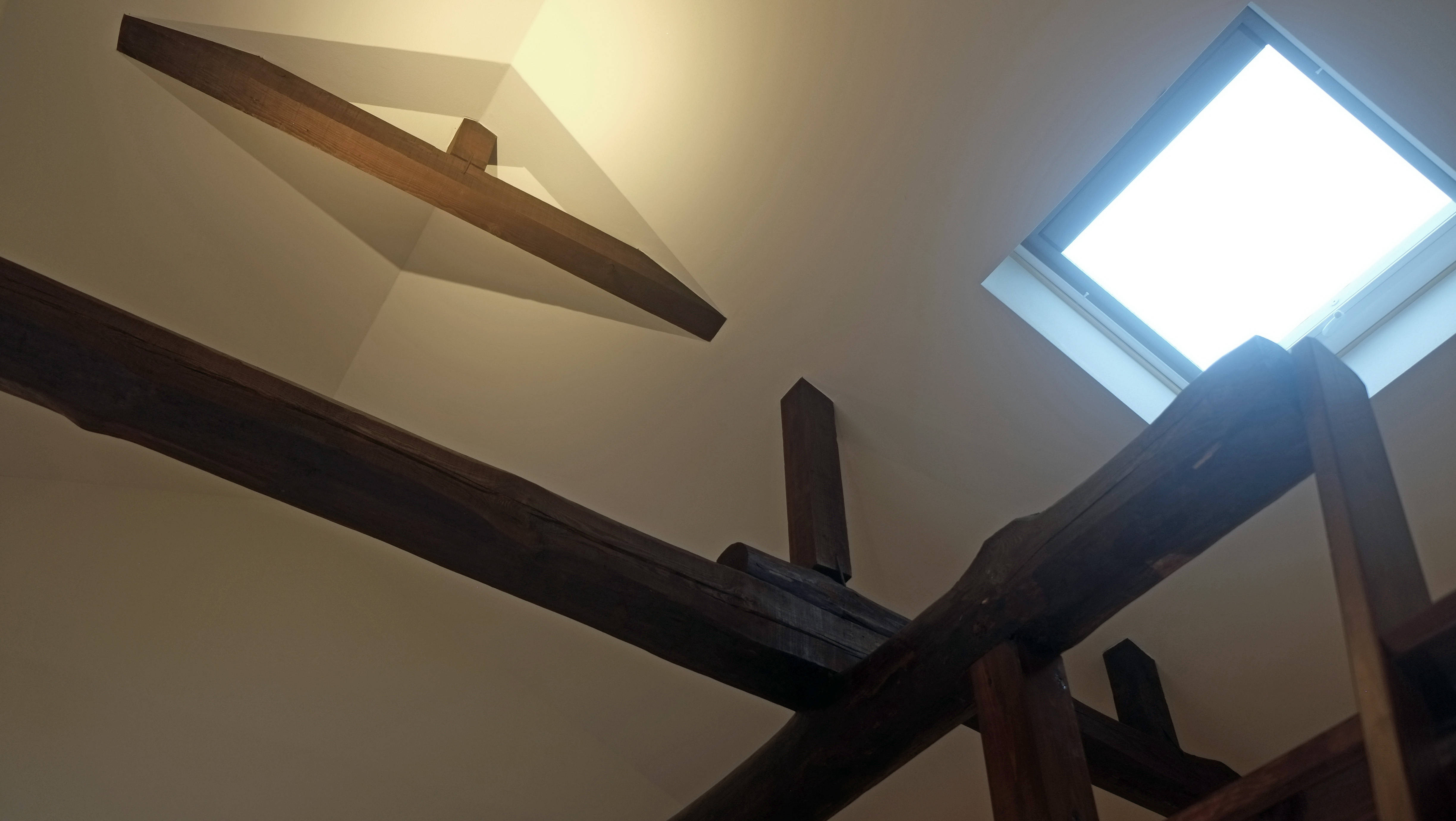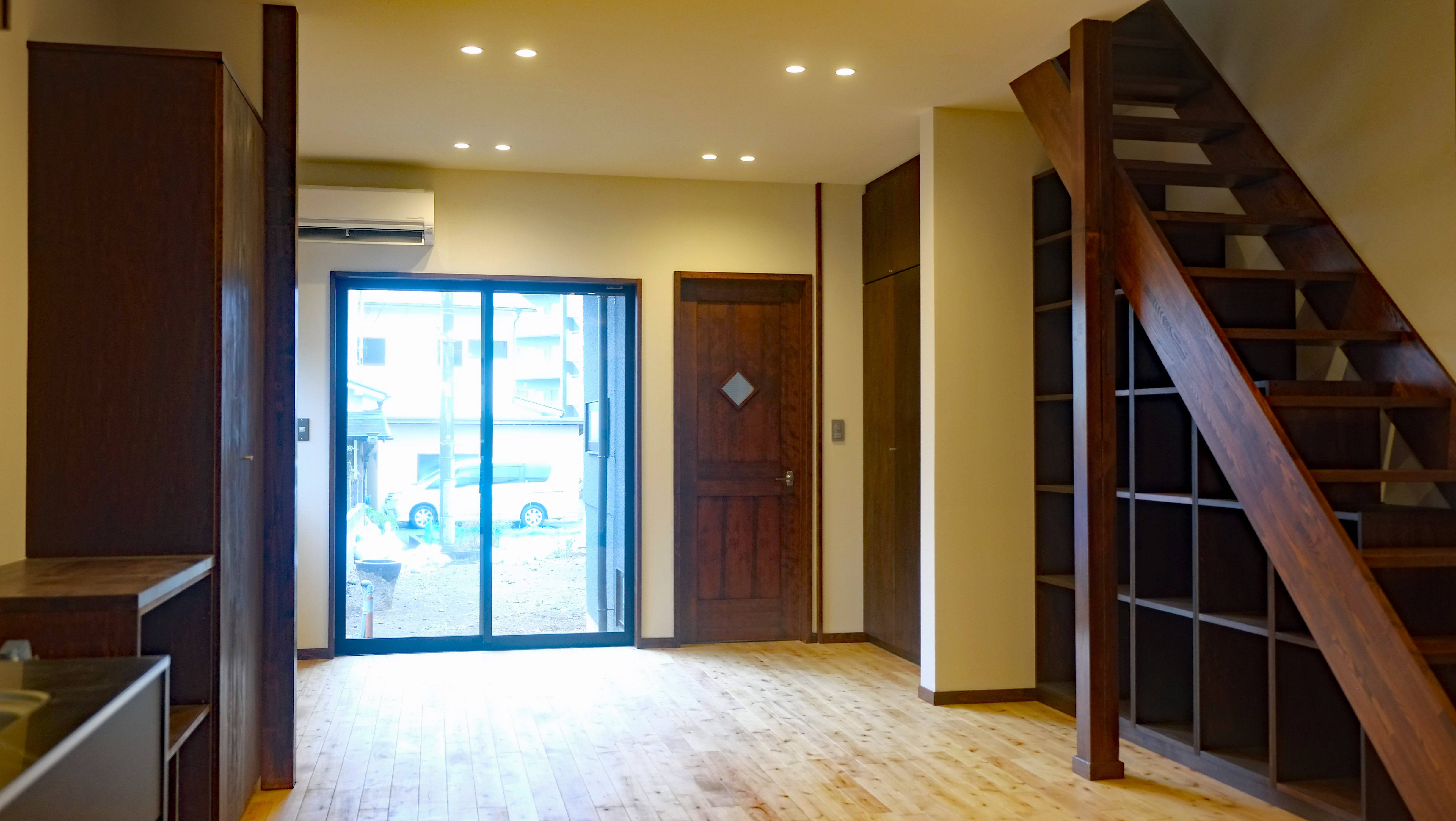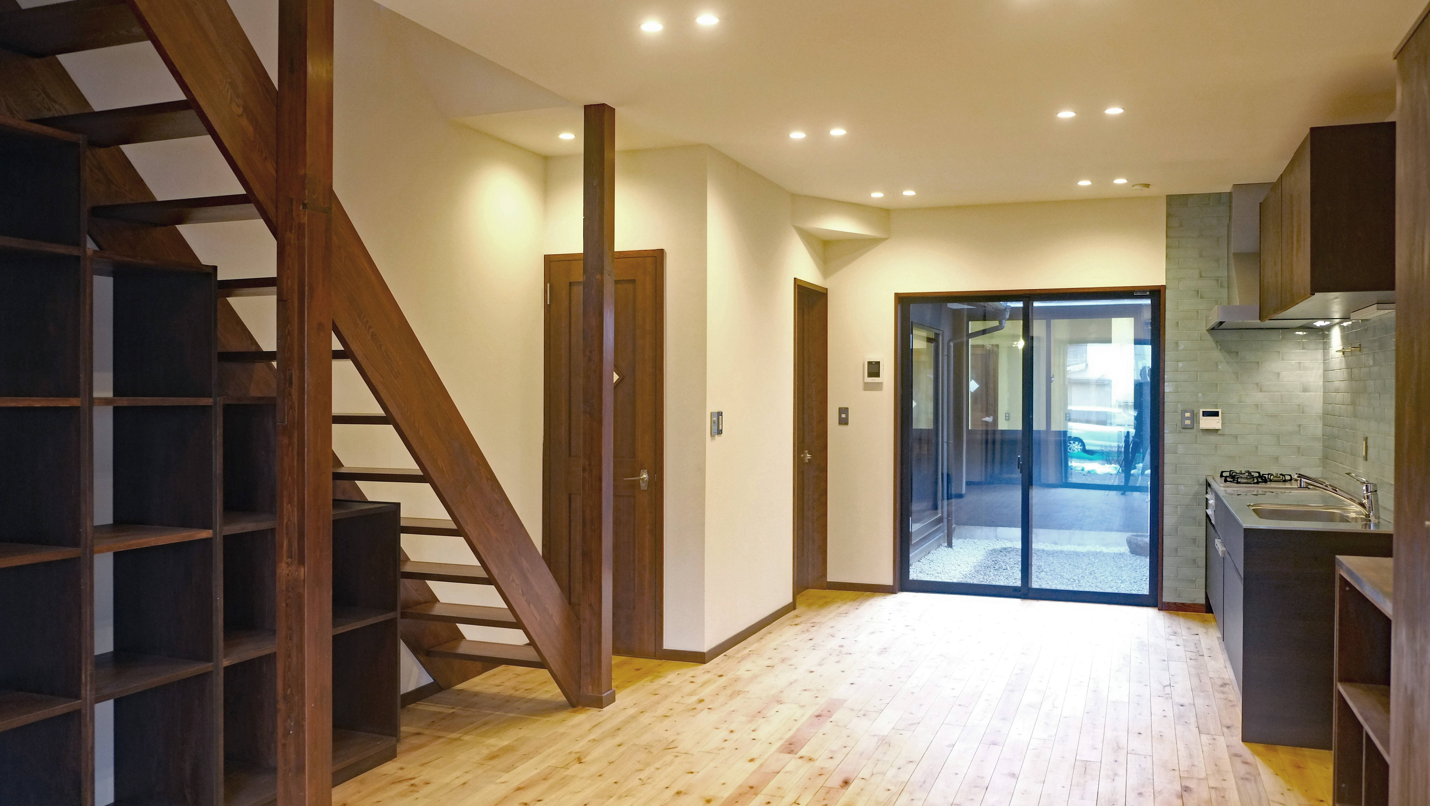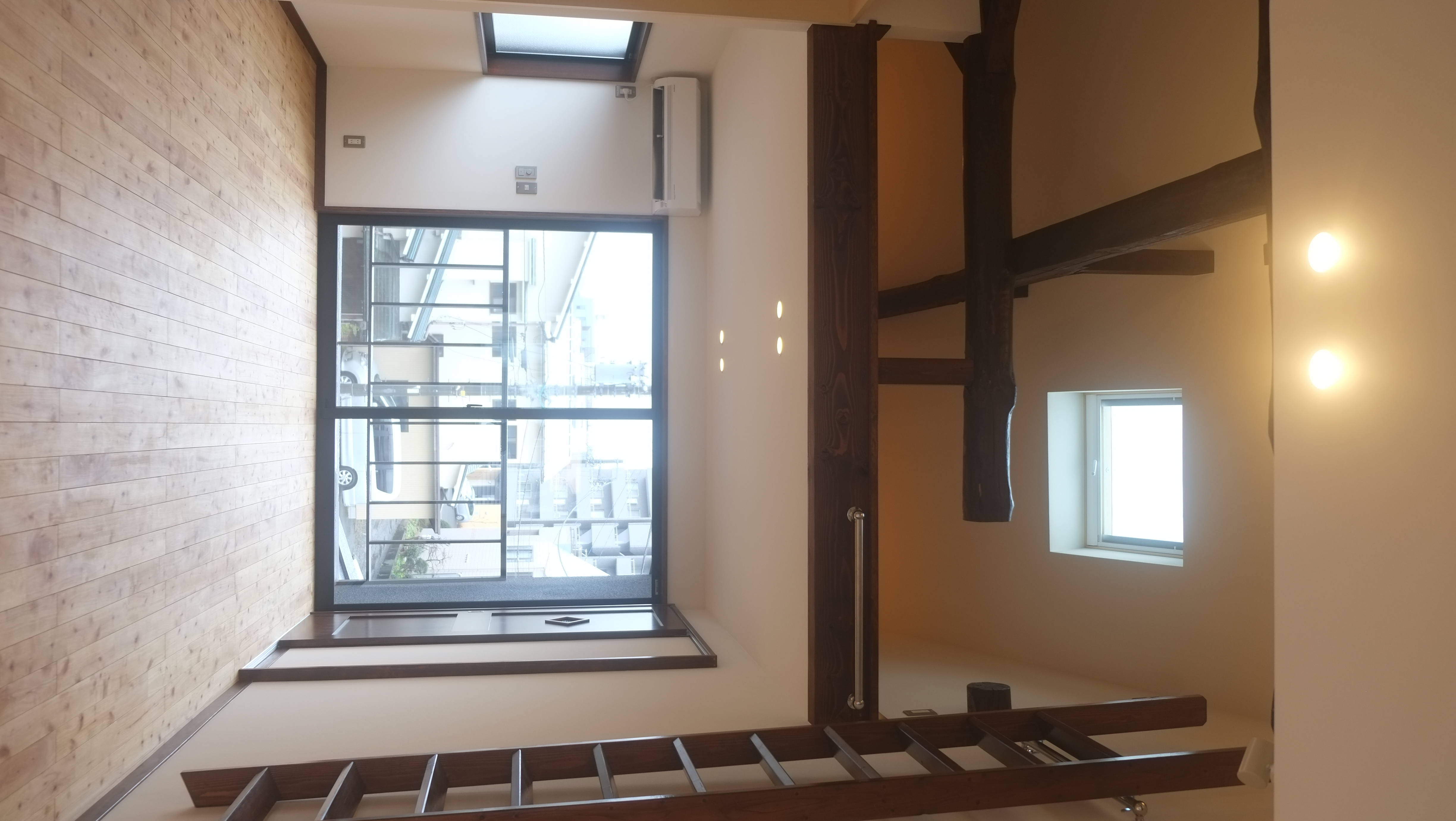 床の無垢材、扉、造作家具はシンプルで和モダンな雰囲気に。陽の光が入りにくい立地で室内が暗く寒いというお悩みには天窓を設け室内に光を取り入れました。冬は天窓からの光が2階をとおり中庭へやわらかく降り注ぎます。天井、床、壁には断熱材を充填、サッシは複層ガラスに交換し暖かな家へと生まれ変わりました。