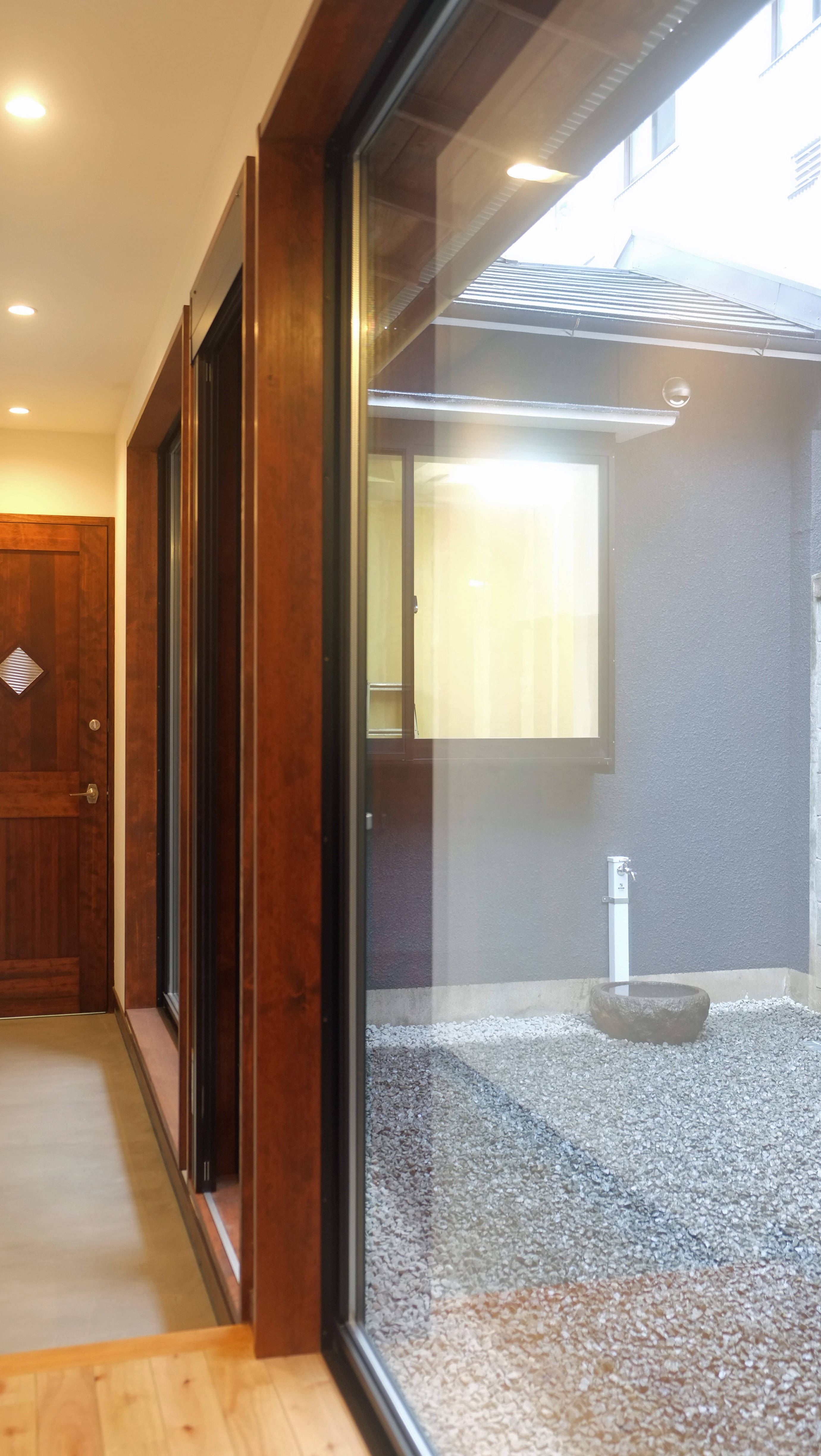 中庭はメンテナンスのしやすさとご家族で作り上げる楽しみを残したミニマルな砕石敷にしています。