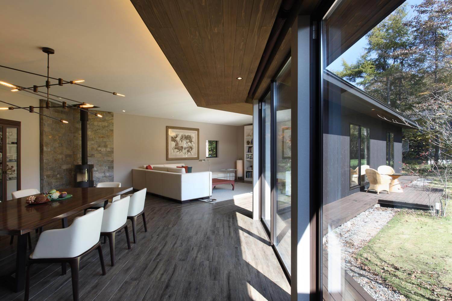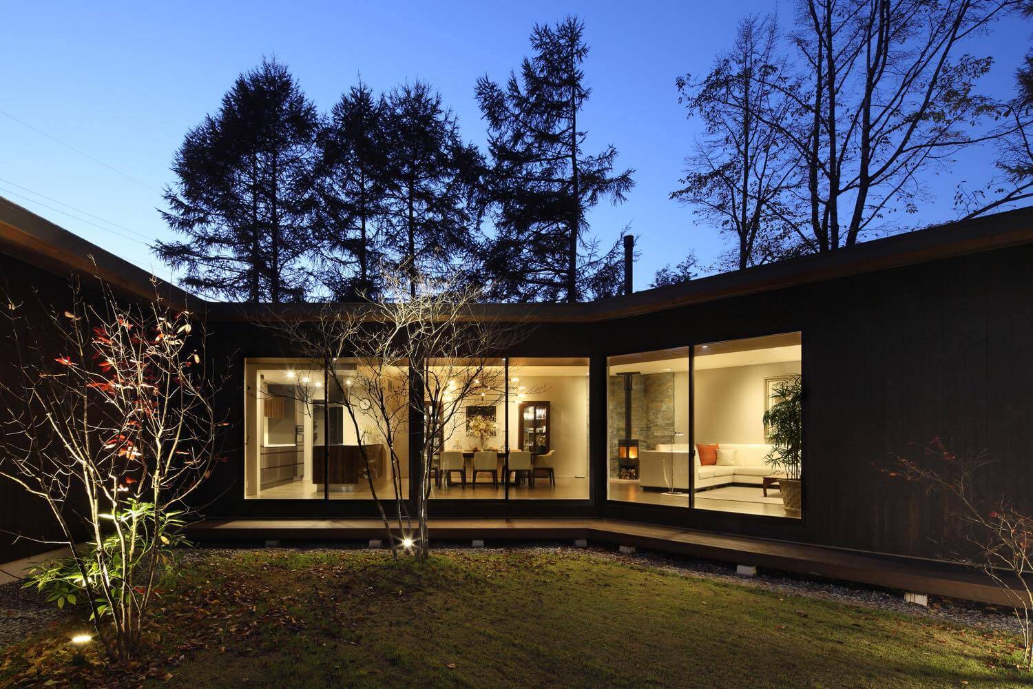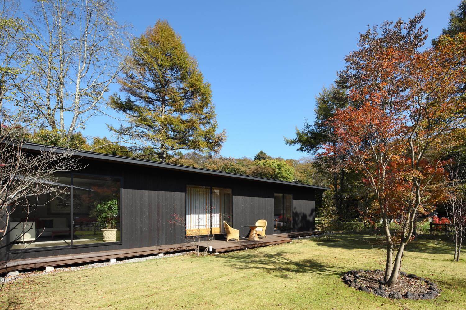 長野県、浅間山を望む景勝地である軽井沢の別荘計画。恵まれた周辺環境を生かす為、また、自然生息する樹木をなるべく残すよう建物形状・配置計画を進めました。建物は敷地を大きく取り囲むような変形の開いたコの字の形状とし、周囲の環境との関り方を区別できるような建物形状としています。