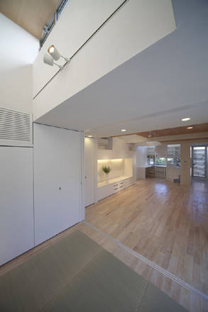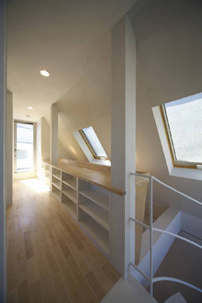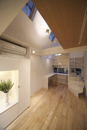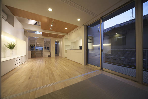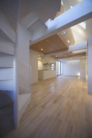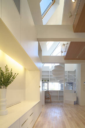 特に2階のLDKは、吹抜や、トップライト、螺旋階段等多様な仕掛けをそなえ、家族が自然に集まる楽しい空間となるよう設計しています。