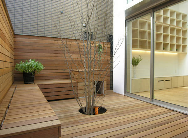 吹抜のあるリビングから光を最大限に取り入れ、ルーバーで囲われた庭と一体になる、開放感のあるスペースを造っています。