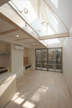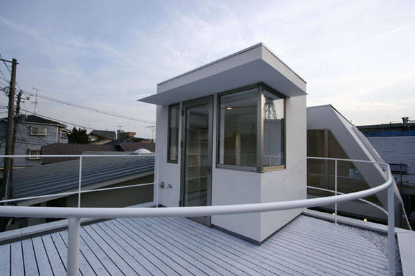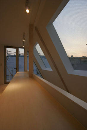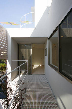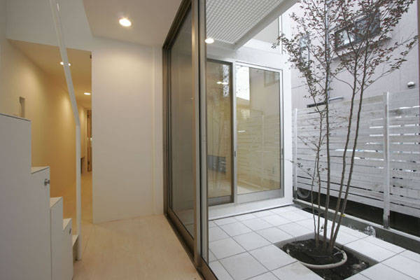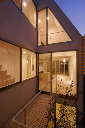 南北に細長い敷地の中央に中庭と階段を配置し、上下移動の際に内部空間を見渡すことができるとともに、内部空間の至るところに、光や風を導き、緑や空の景愉しむことのできる住宅です。