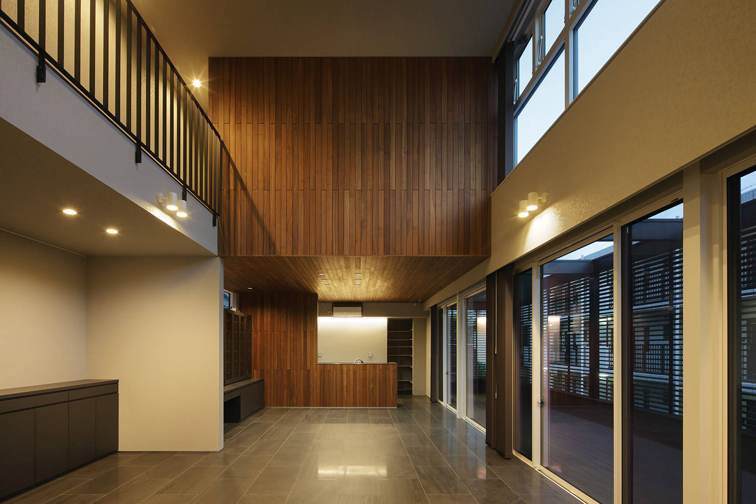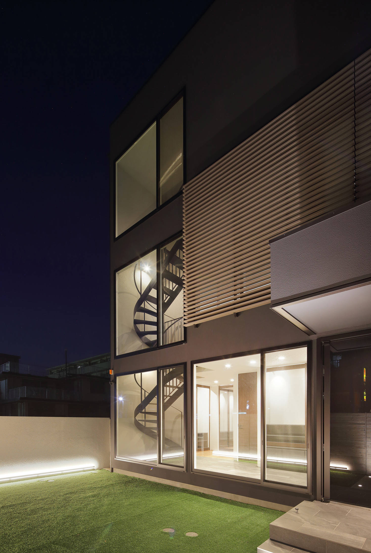 1階はガレージと玄関・収納・ギャラリー、2階はLDKと水回り、それに面なる大テラスはルーバーで囲み光や風を通しながらプライバシーを守り外観に優美さを持たせている。
