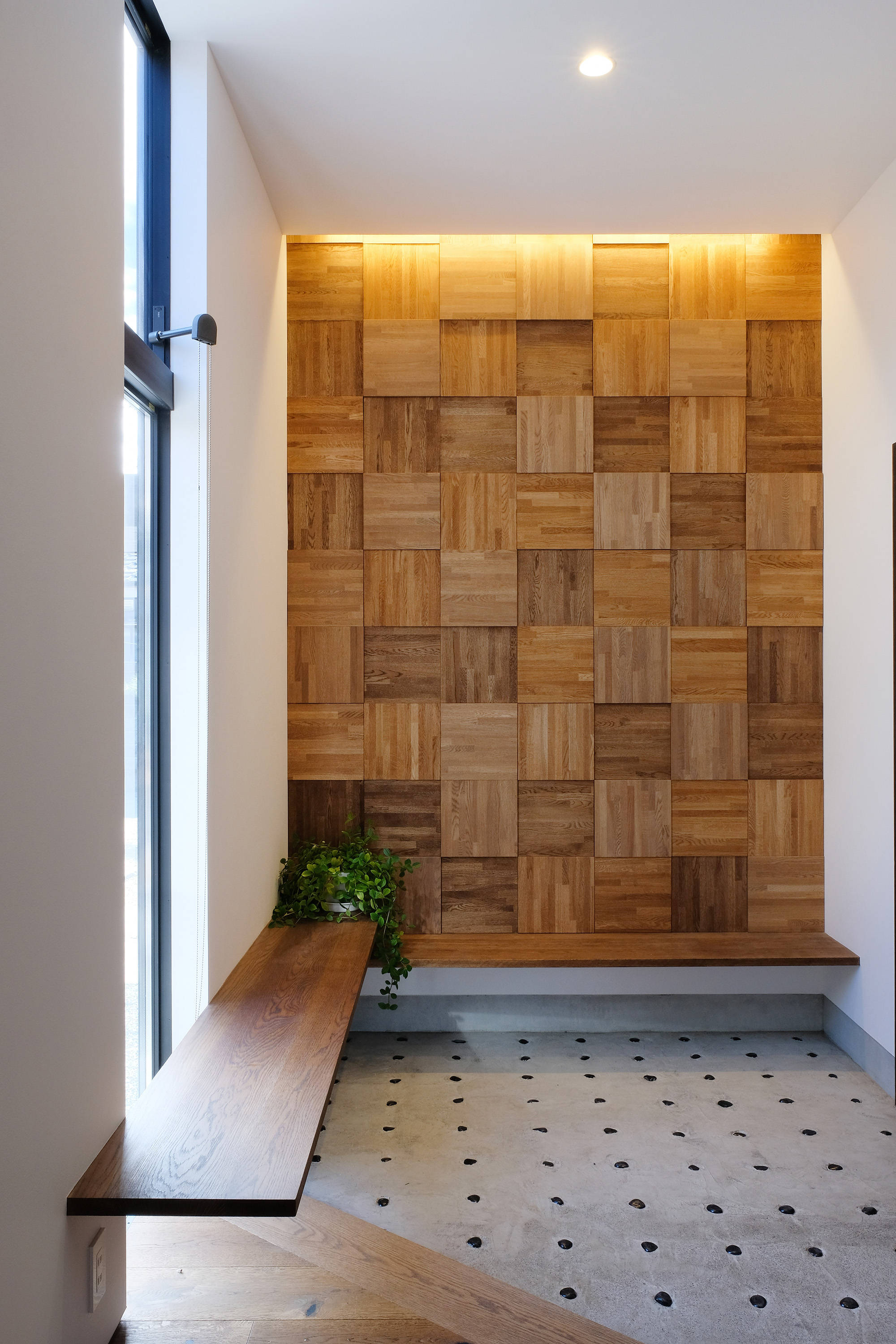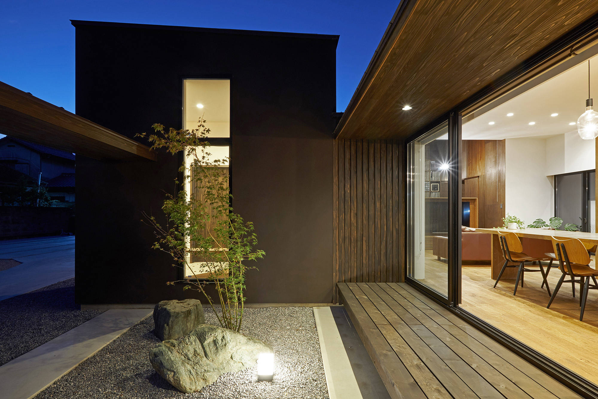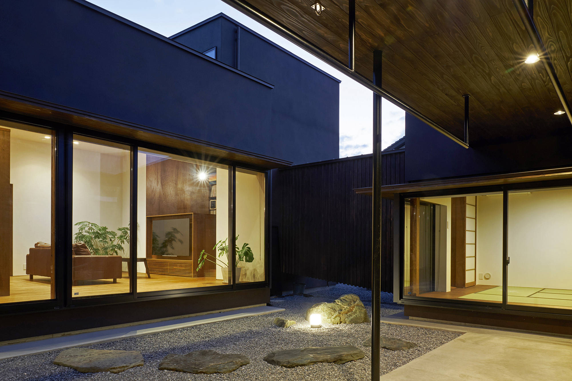 ご家族4人のための住宅。四方がほぼ等距離の250坪、3方は車も通る事が困難な道で囲まれていた。敷地にあった竹林、松、庭石、井戸、お稲荷様や車道などを記憶として残し各々を再構築した。
