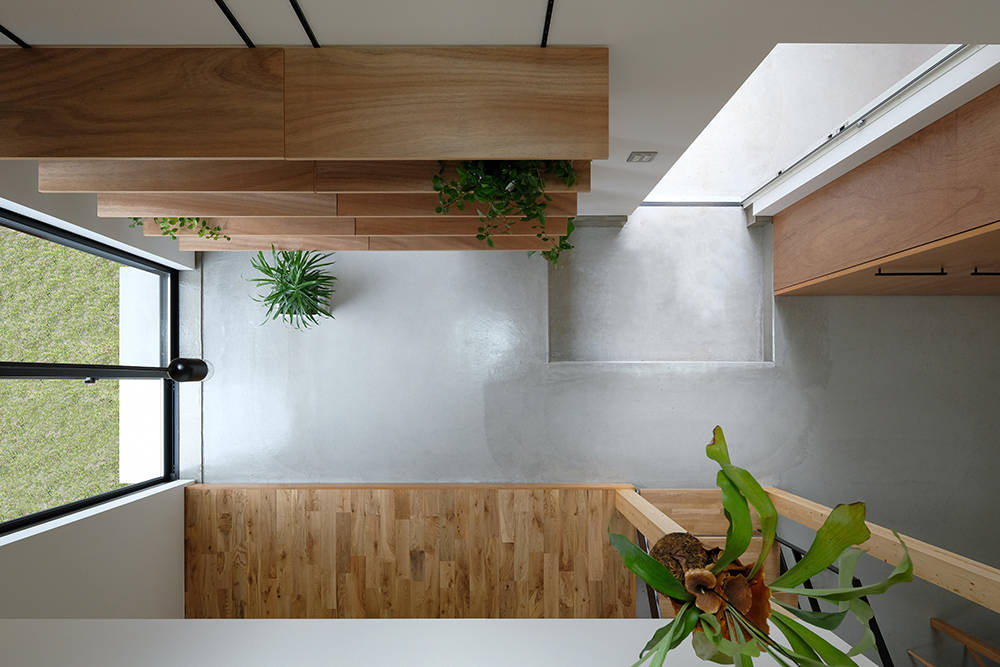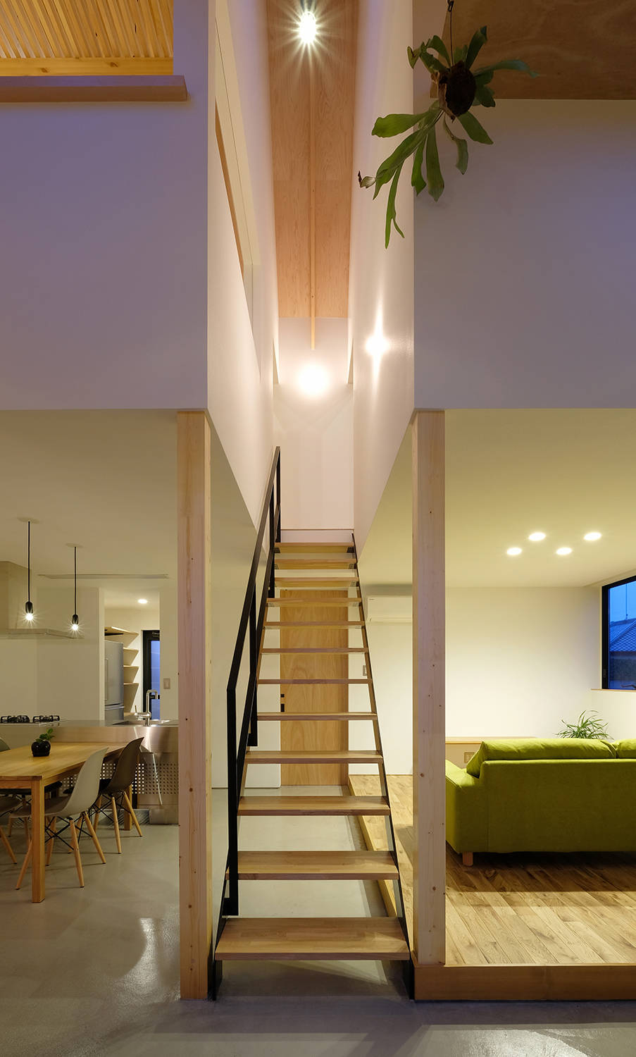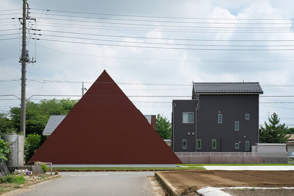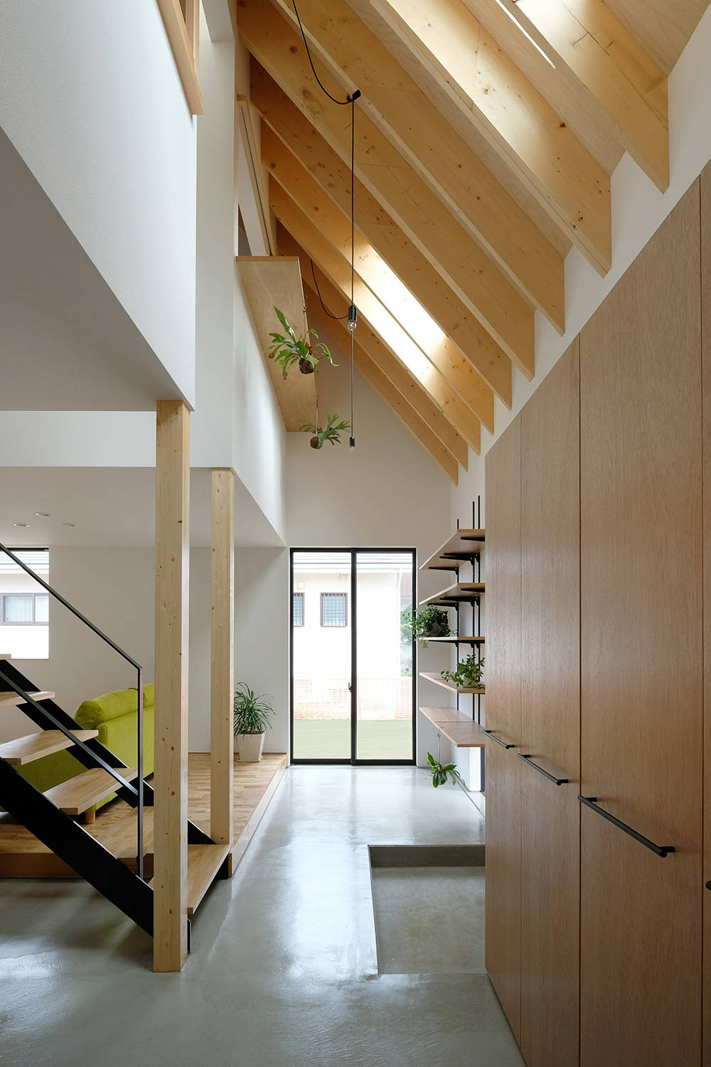 軒を土台まで伸ばす事により外観は東西に長い三角形のボリュームとなり、外壁は統一感を出すため屋根と同材としている。北側は道路からの視線や音を遮断する為窓を設けず、東西に設けた天窓と南の窓により採光を確保した。三角の大屋根が施主の願いを優しく包み込んだ住まいとなった。