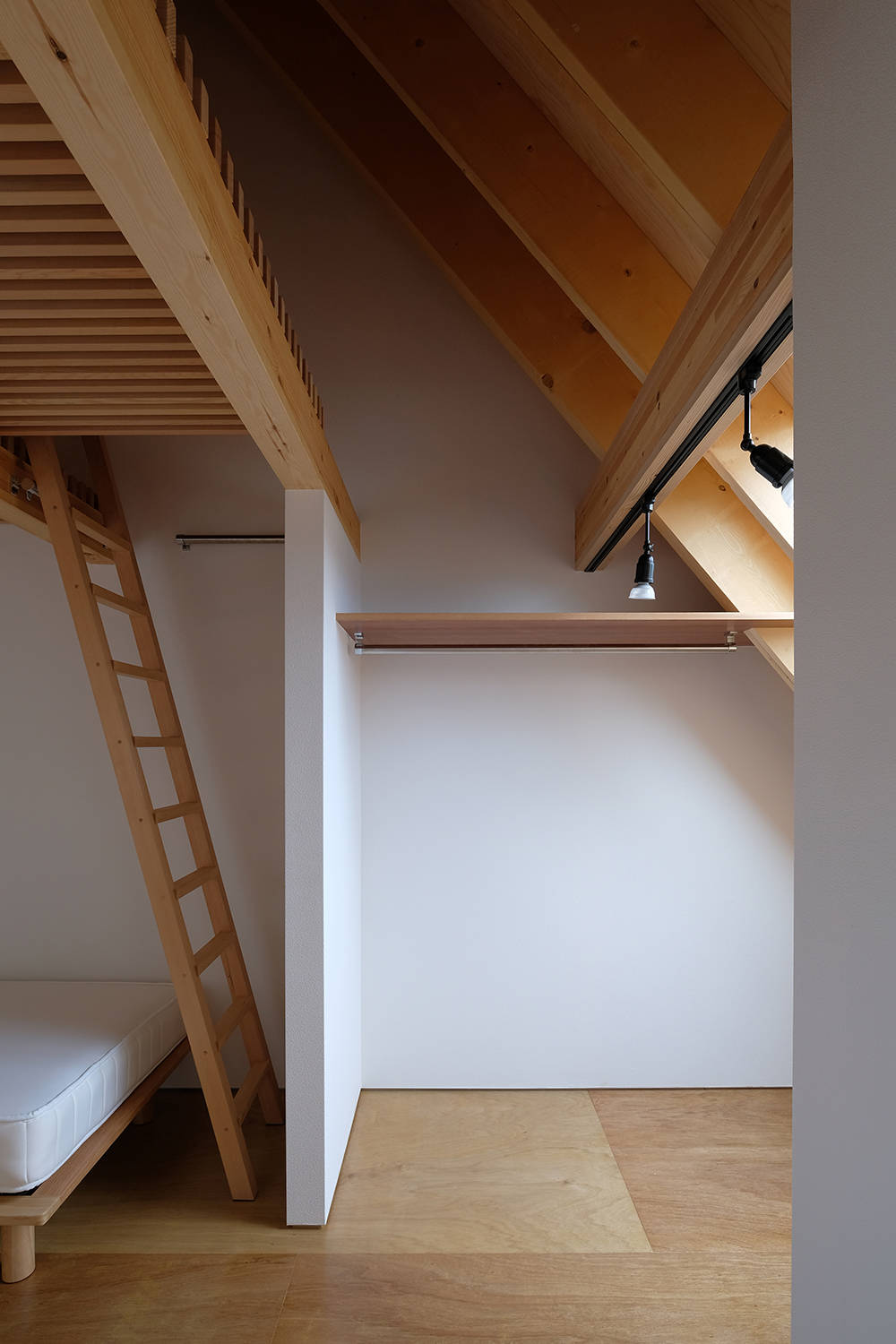 平面計画は1階にLDKと水回り、2階には居室といったシンプルな構成とし、凸形の躯体とする。そこに2x10の垂木を土台の高さまで架けることで、内・外部に吹抜や収納、設備スペースといった軒下的空間を生み出した。