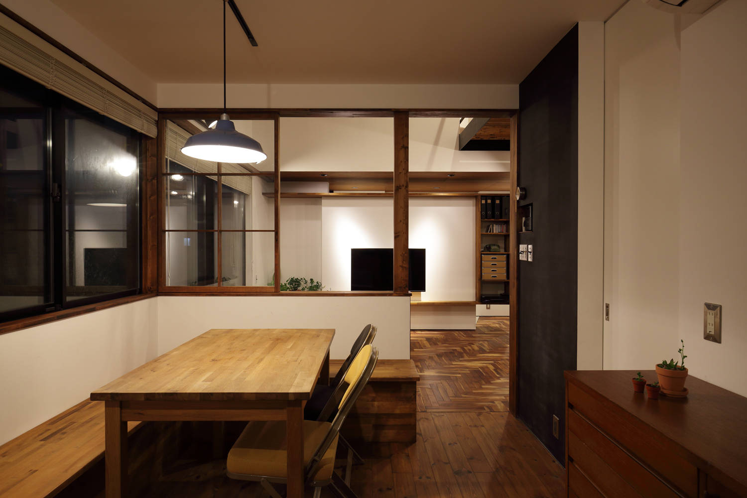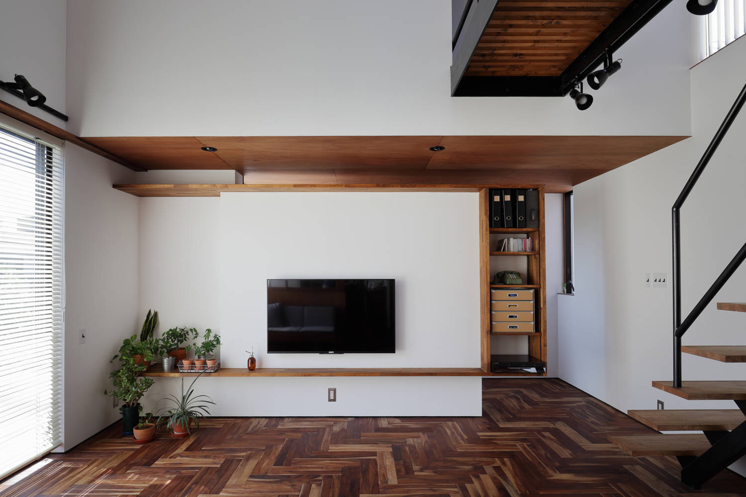 余分な面積をそぎ落とすため各室は廊下を挟まずダイレクトに繋がる平面とし縦方向に様々な高さで積み重ね、多様な窓や開口を設ける事で拡がりを持たせている。外部はモルタルに塗装、内部はヘリンボーンを大工による斜め貼りとし、ラワン、壁、スチール等の塗装とタイル工事等吹抜けにする事で工事費がかさむ箇所は全て施主が自ら行った。