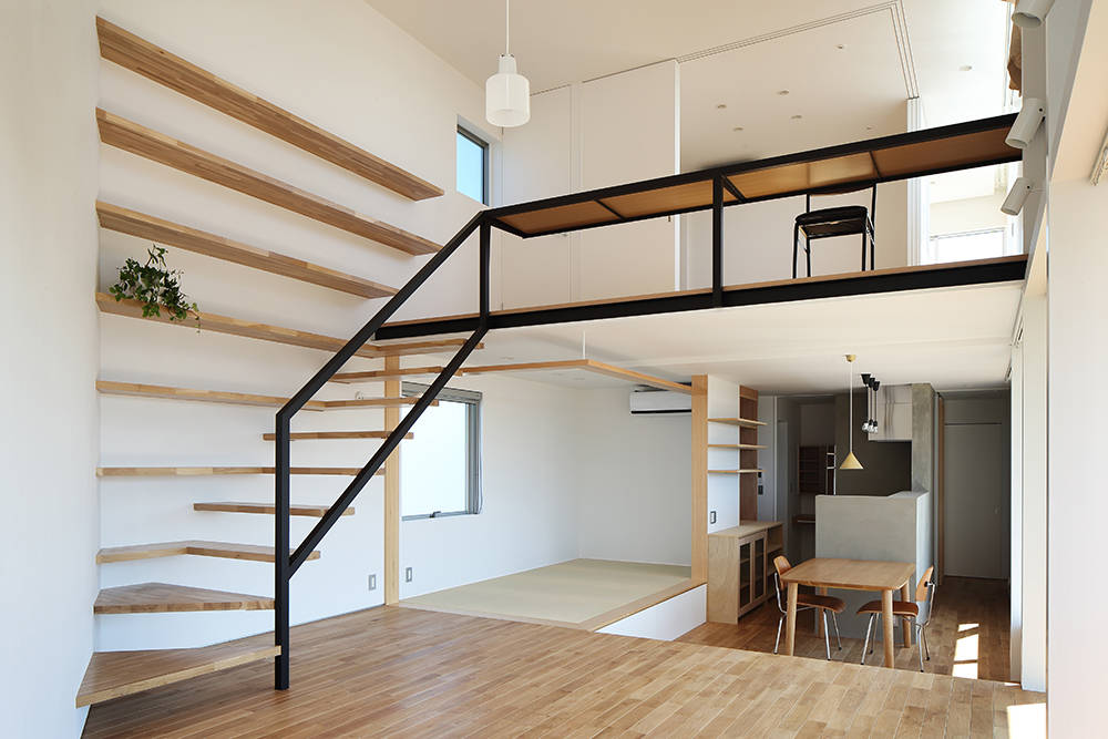 平面を曲げる事で道路や駐車場から守られた庭を生み出し南からの光を取り込んでいる。LDK西側の壁にも角度を持たせ視界をより拡げている。リビングから近い関係性をワークスペースに求められたため、2階の床を極力薄くした。双方を繋ぐ階段を本棚とし一体的な利用を可能としている。
