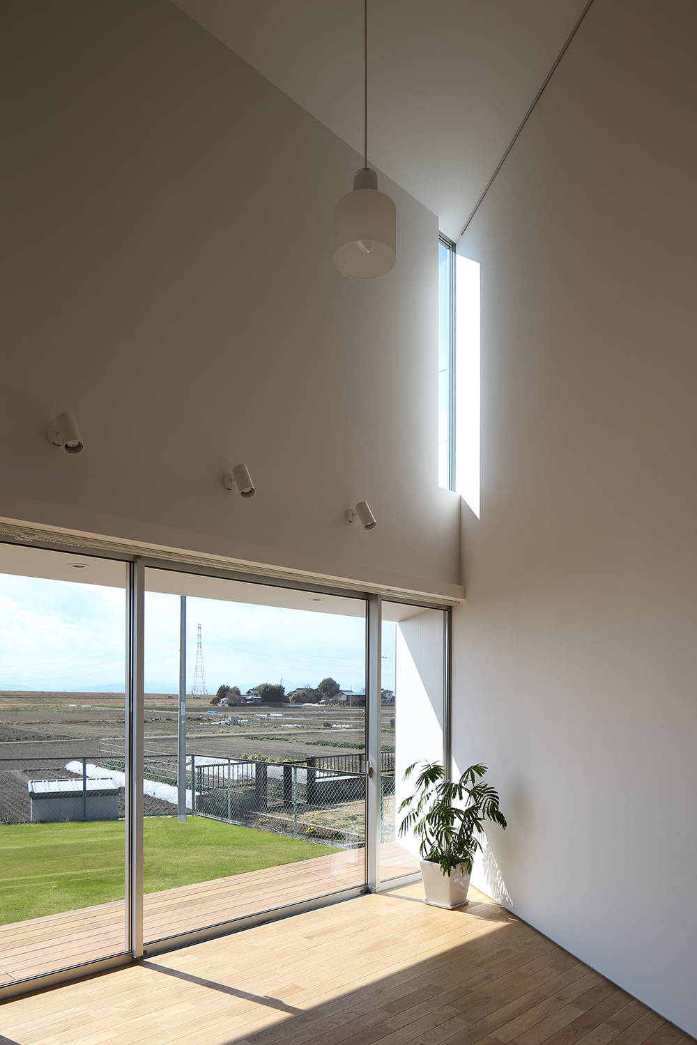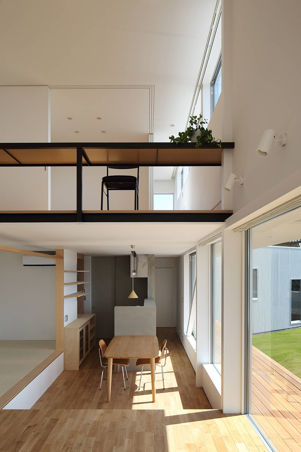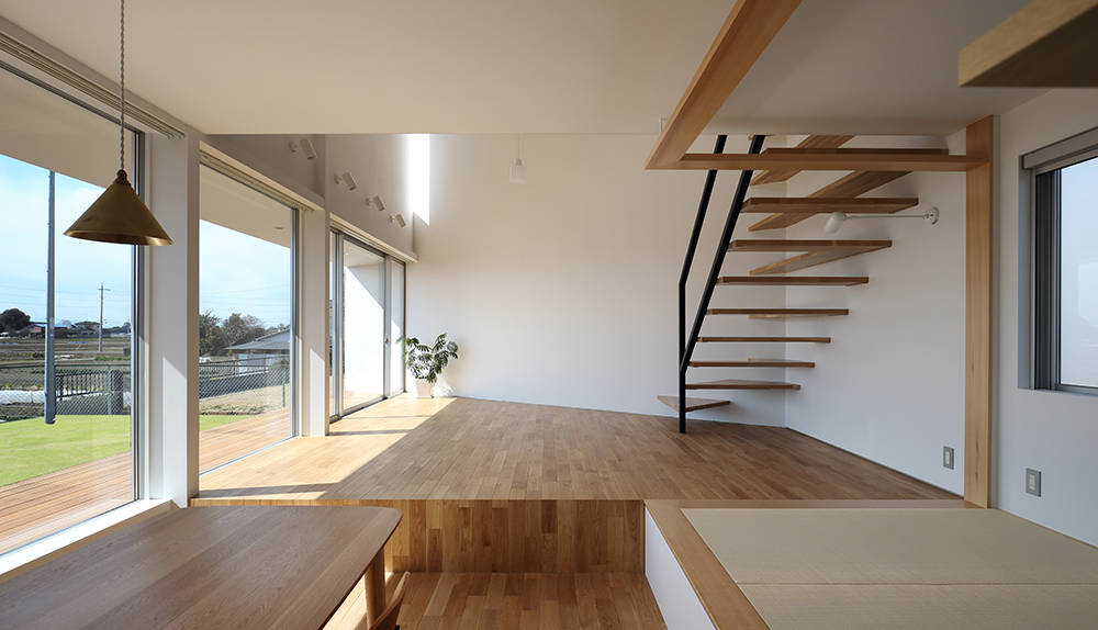 敷地の南西には利根川の土手が広がっているためそちらへの羨望を生かす計画とした。LDKを敷地の1番良い場所に設定し、そこからくの字になるように水回り、WIC、平屋の玄関、アトリエを繋げた。