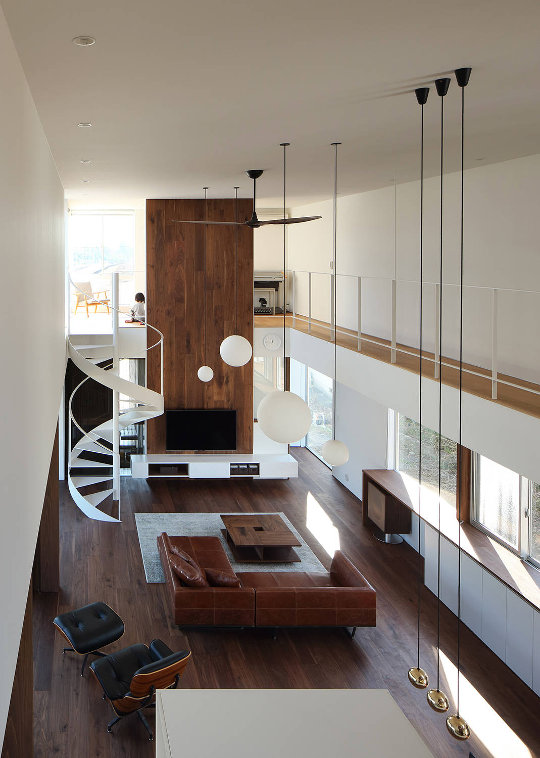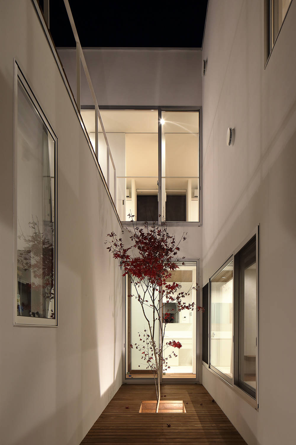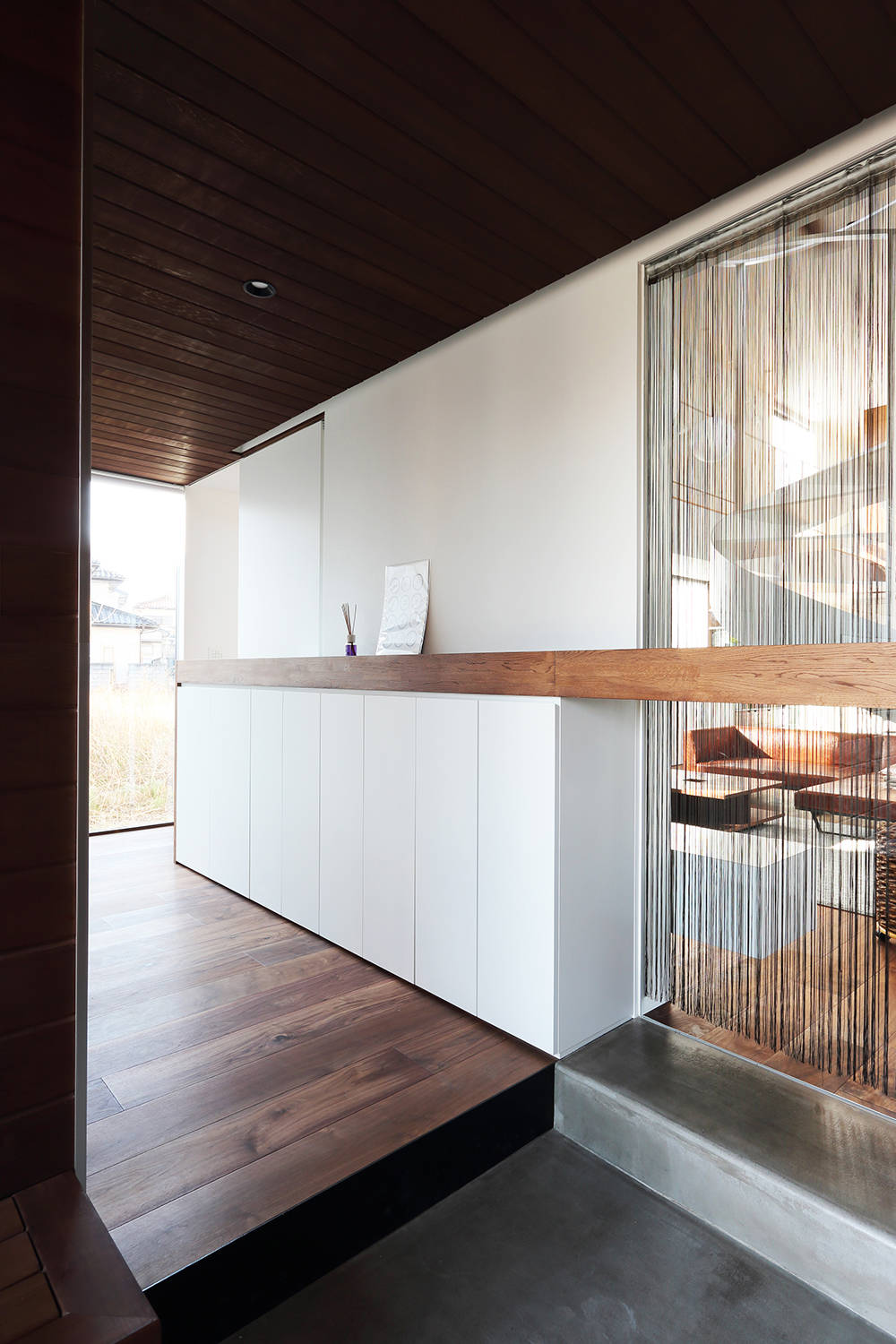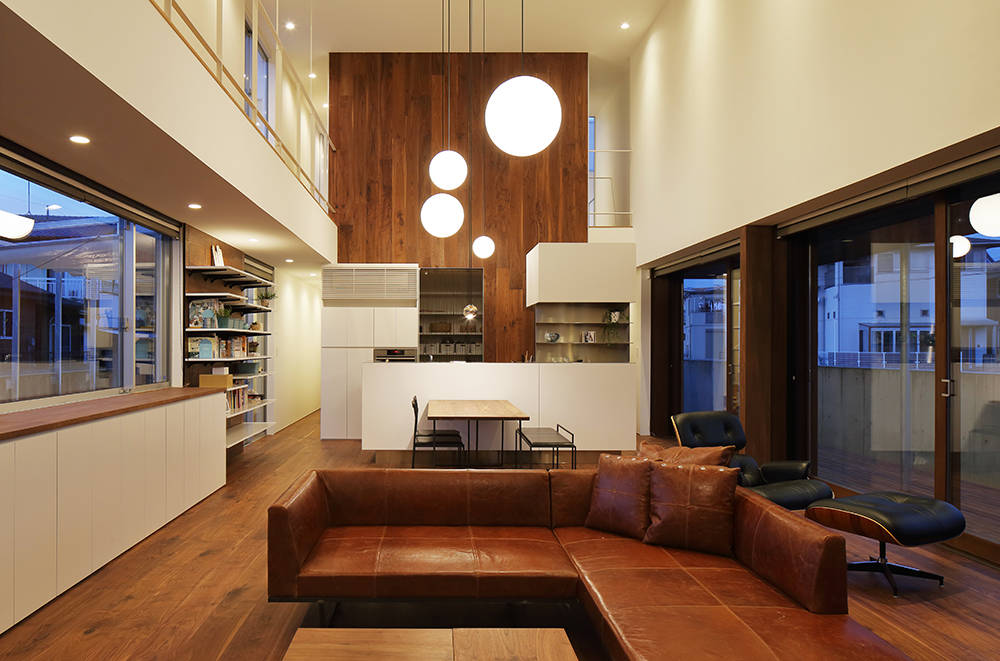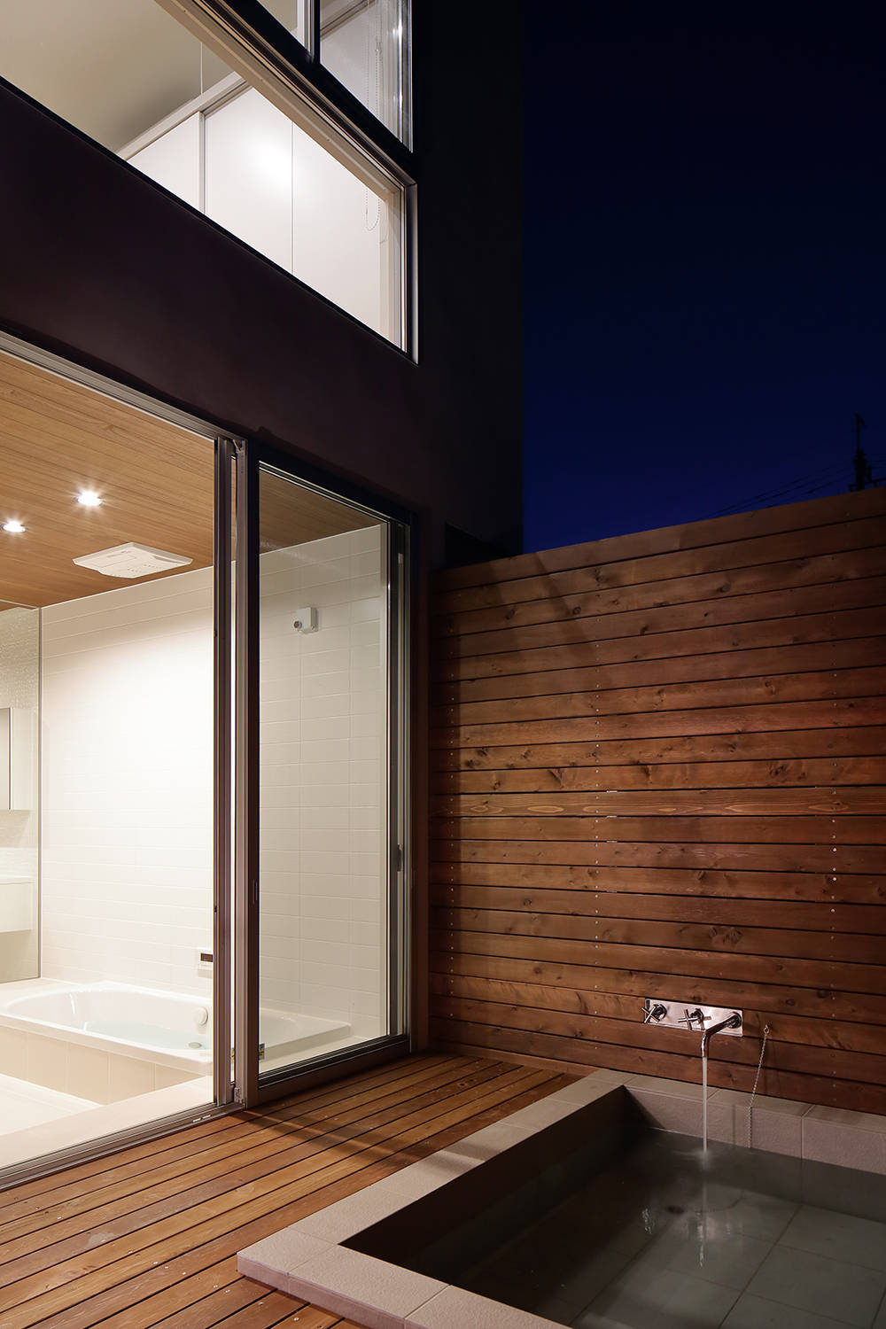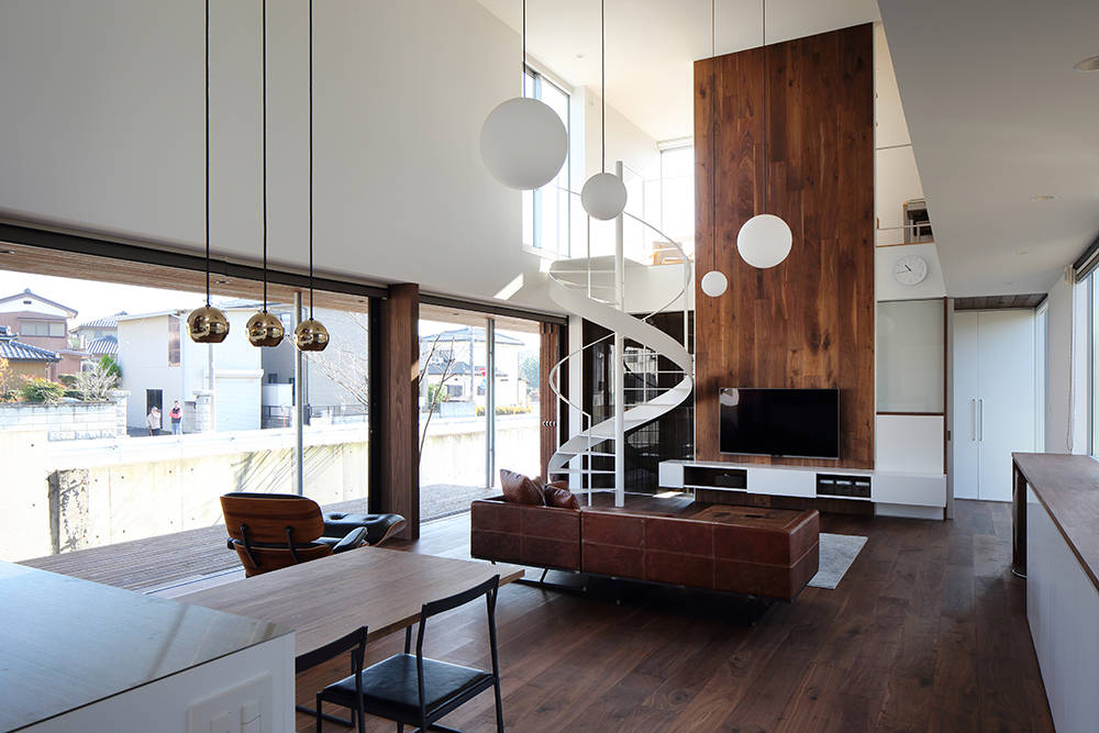 西側には水周りとプライベートデッキを設けユーティリティースペースとして活用できる。その他にも効果的にドライエリアを設け居室に光と風を届け、浴室部分には露天風呂を配している。同じ空間にいながらも各々が自由に過ごせる事が出来る、距離がもたらす新たな身体的感覚を我々に教えてくれた住まいとなった。