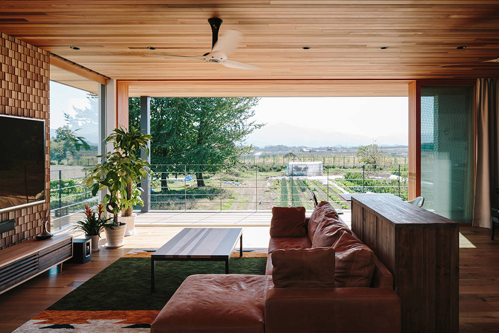 LDKは40畳のワンルームとし、テラスとフラットに繋がり窓を開放すると風景と混ざりあう。業務用のステンレスキッチンや家具を想定しながら仕上材や色を注意深く選定した。故郷へ戻られたご家族が都心では味わう事が難しい自然を満喫しながら、豊かな生活が送れればと願っている。