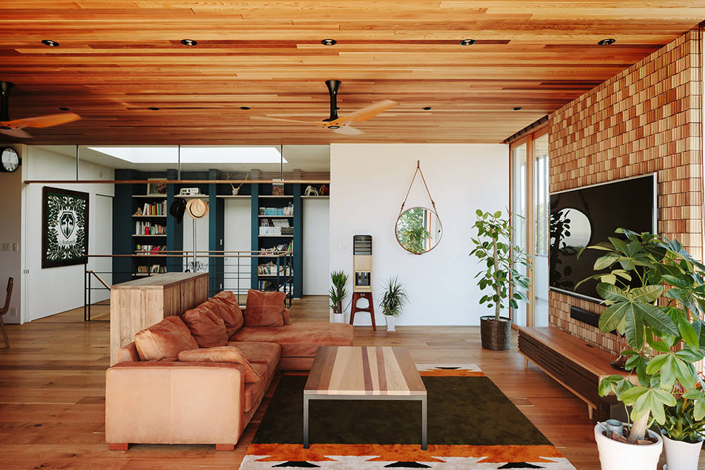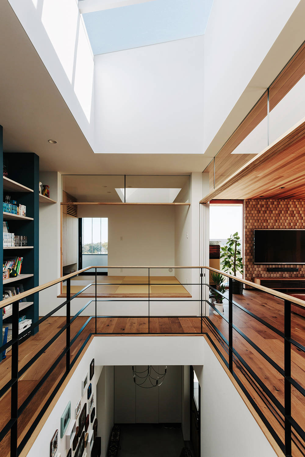 住宅は敷地が周囲より小高い場所にあるため、その羨望を生かす計画とした。上階へ向かう大階段は建物のほぼ中央に位置するため上部に天窓を配し階段周りのギャラリー、ライブラリースペースを共に照らす。
