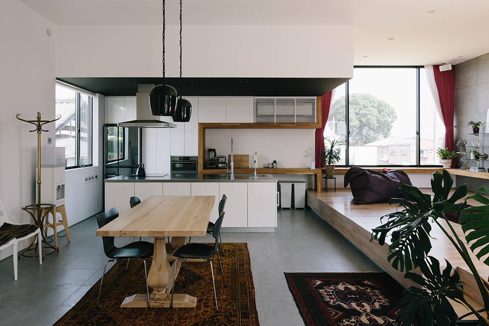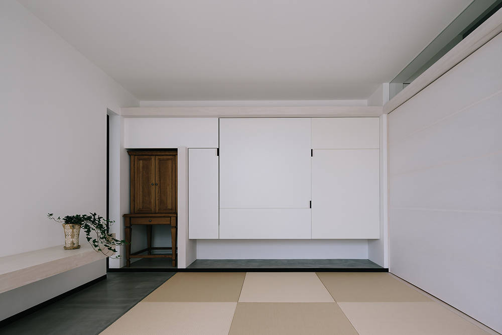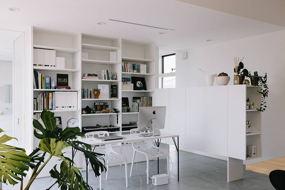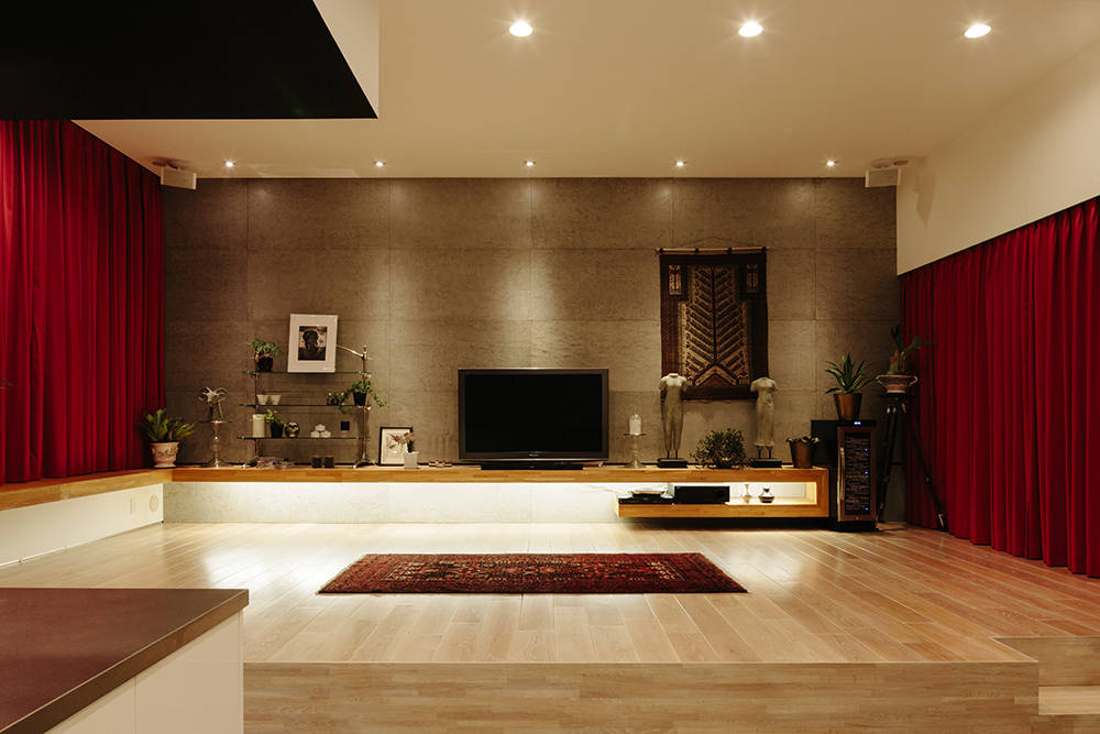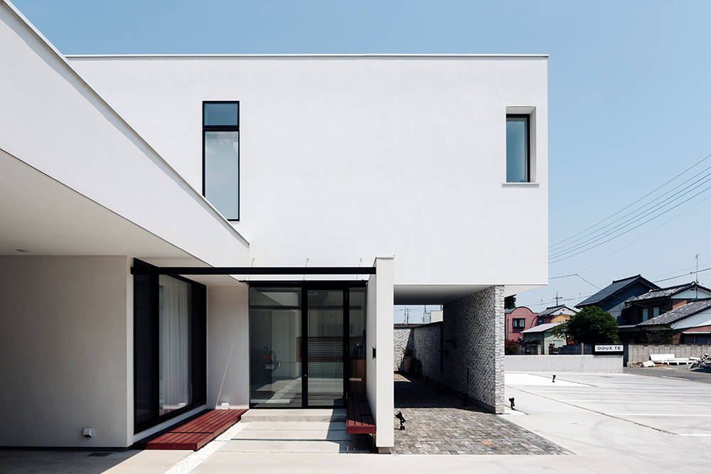 住居は壁のレイヤー間にエントランスを配し側面からアプローチする。またその壁を目隠しとし、ゲストルームや美容室の着付けスペースとなる和室を設置。2階は住居として必要な機能をテラスを取り囲むように配しているため、地上レベルからは想像出来ない程開放性が有る。ボリュームや壁の間から諸室の採光を得る事で外観を整えるだけでなく、内部のプライバシー性能を高め居住性の向上をも計っている。