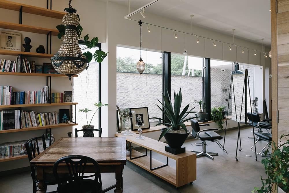 アンティークのドアや受付等オーナーが揃えた家具が店内に散りばめられ、ゲストは自然光に溢れる場所に腰を下ろす。外の視線がない事でスタッフとの会話に入り込む。待ち時間も有意義に過ごせるようウェイティングエリアやソファエリアを配し、最奥にはドレス&メイク、スタジオスペースを設けサロン全体が|美|を意識させる空間となっている。