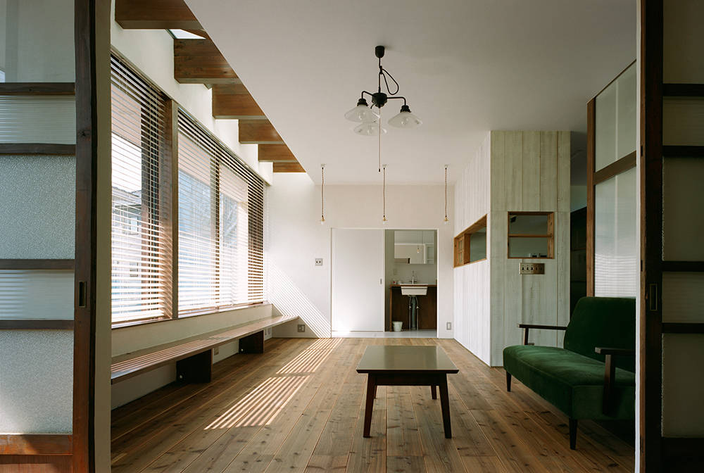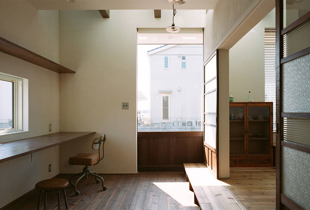 ご夫婦が使用する古材や建具を選定し、我々が設計に落とし込み入念に空間を作りこんだ。ご主人拘りの書斎と繋がるリビングは3.5m以上開放出来る木サッシを持ち、その前にベンチにもステップにもなるカウンターを設置した。