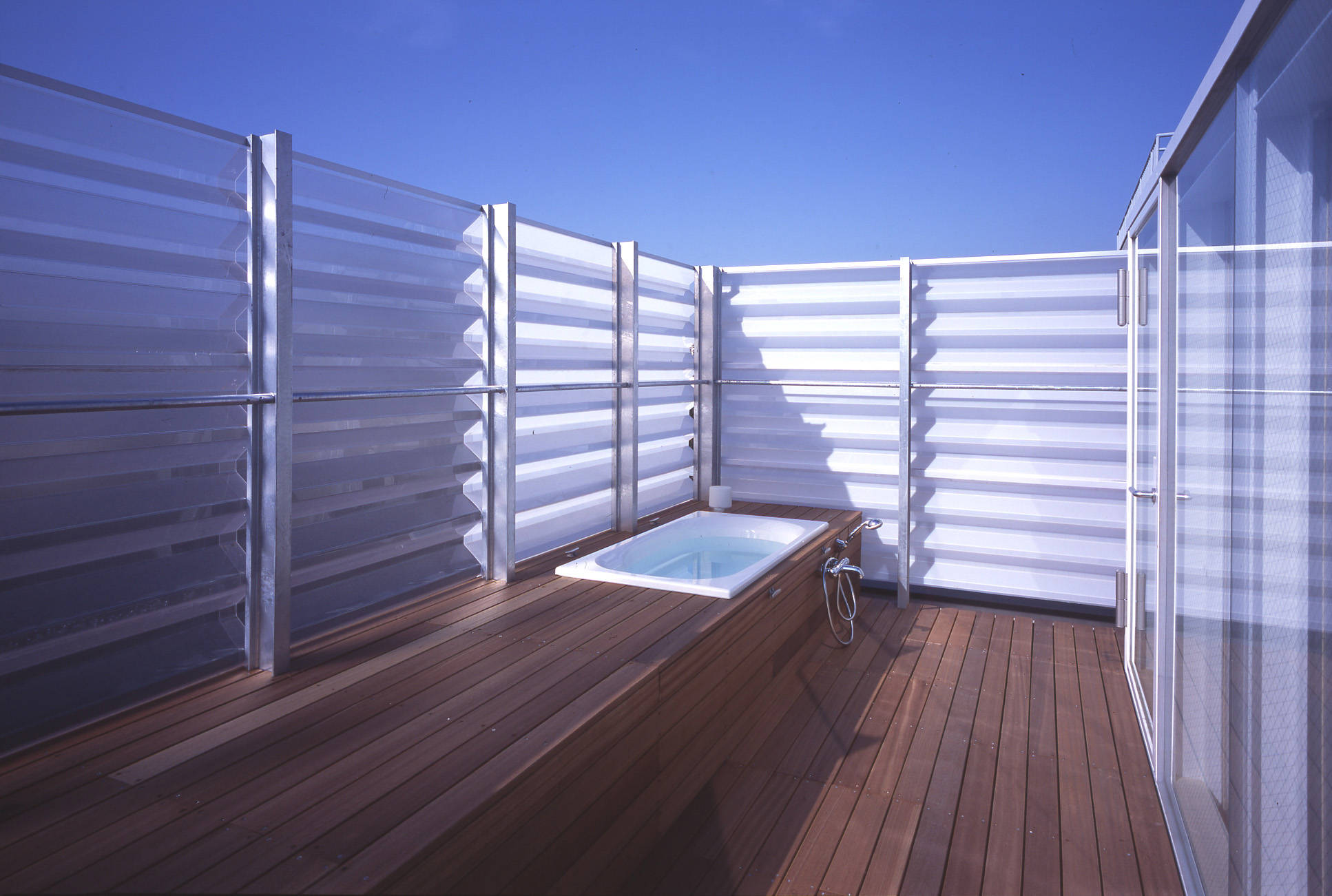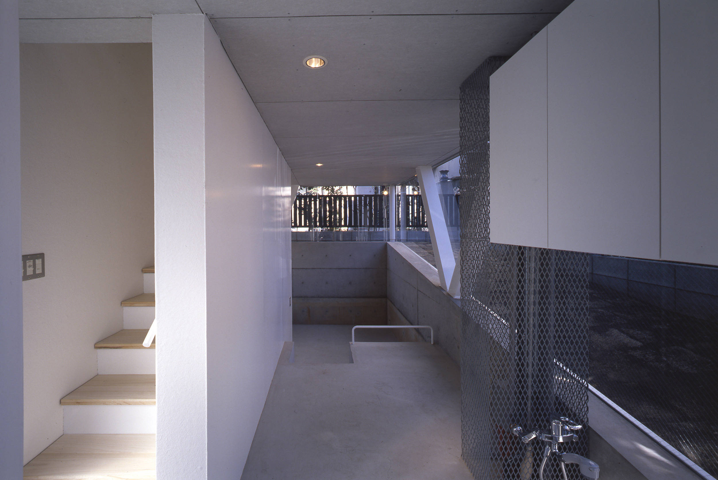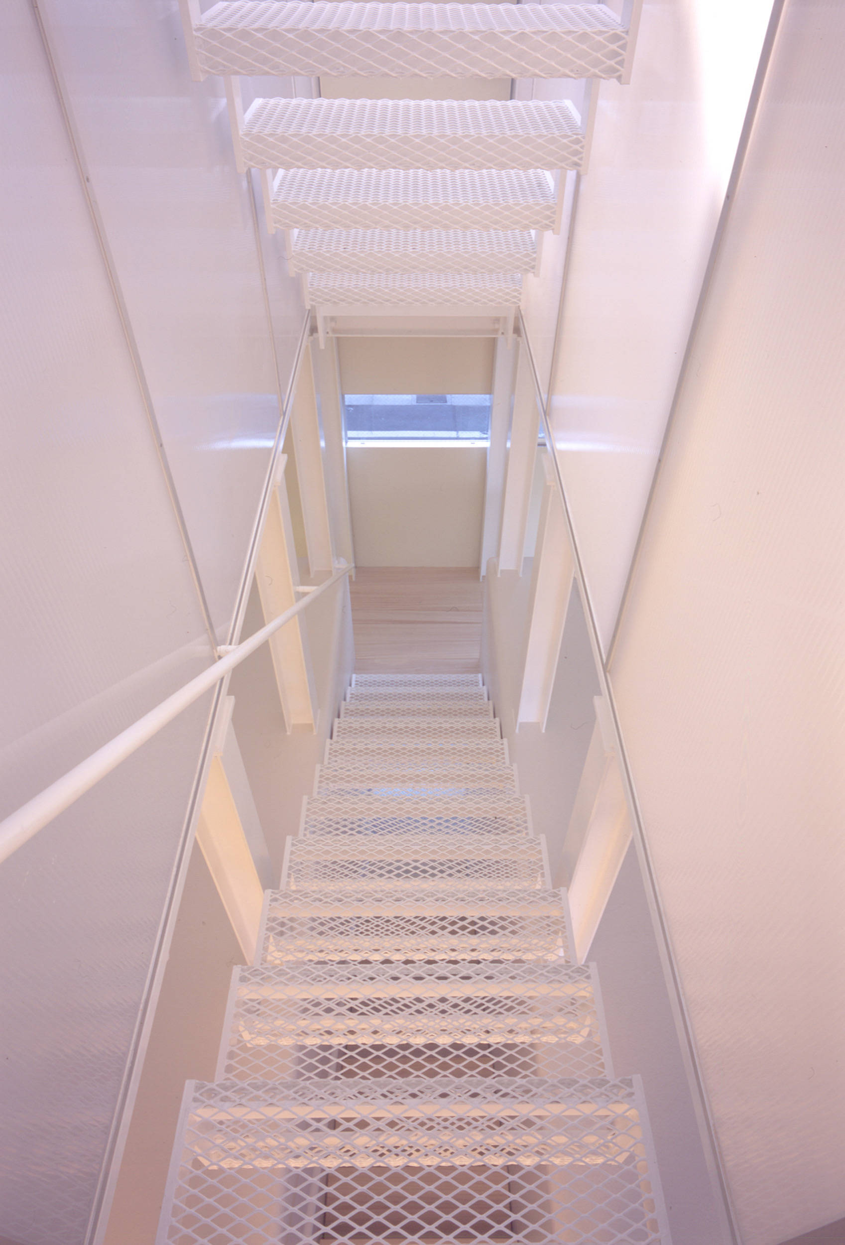 立方体の中にはLDKや個室などの居室を配し、適切な高さの水平窓を使って外からのプライバシーを確保しました。黒い立方体の下は駐車スペースと趣味の部屋を、上には広いルーフデッキとスカイバスを用意しました。正方形の平面の中央には、縦に貫く階段を少し偏心させて設置して、左右の空間のヒエラルキーをつくり、建物全体の回遊性と光が貫く光井戸として機能するようにしました。