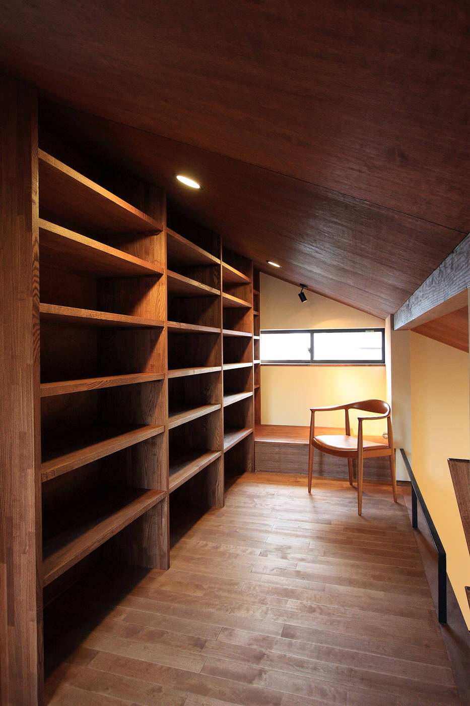 一番のコンセプトは、日常空間とは別に読書家の主人のため、非日常空間を造ること。日常の生活空間は柔らかな陽の空間、非日常の空間は重厚な陰の空間としたことにより、家としての深みはより一層増したように思う。