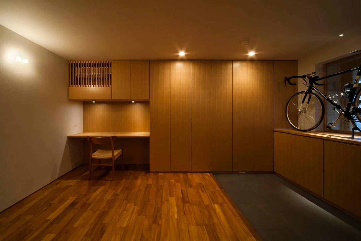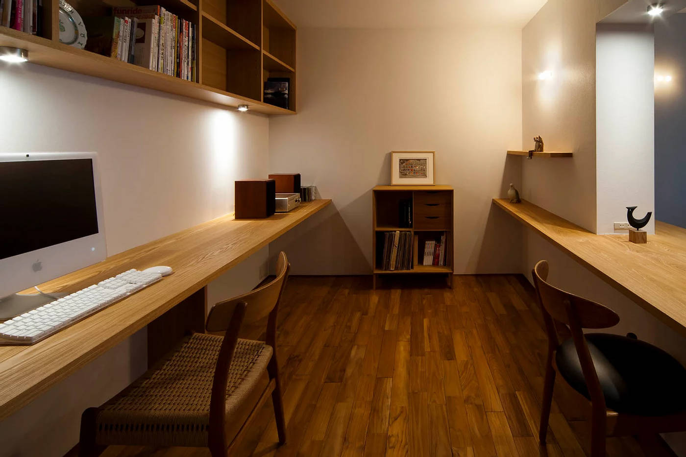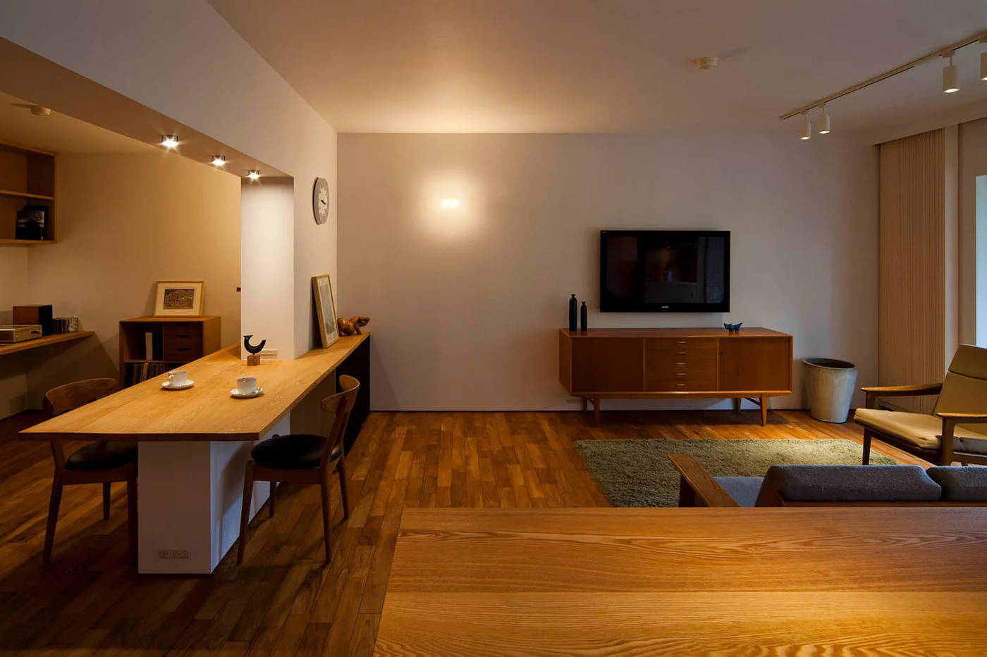 室境界にあった構造壁に絡ませて ダイニングテーブルを造り付けました。