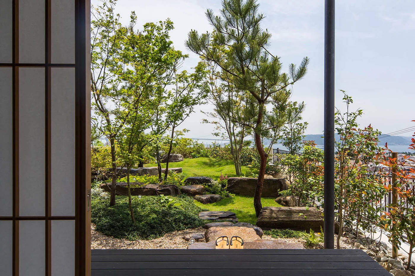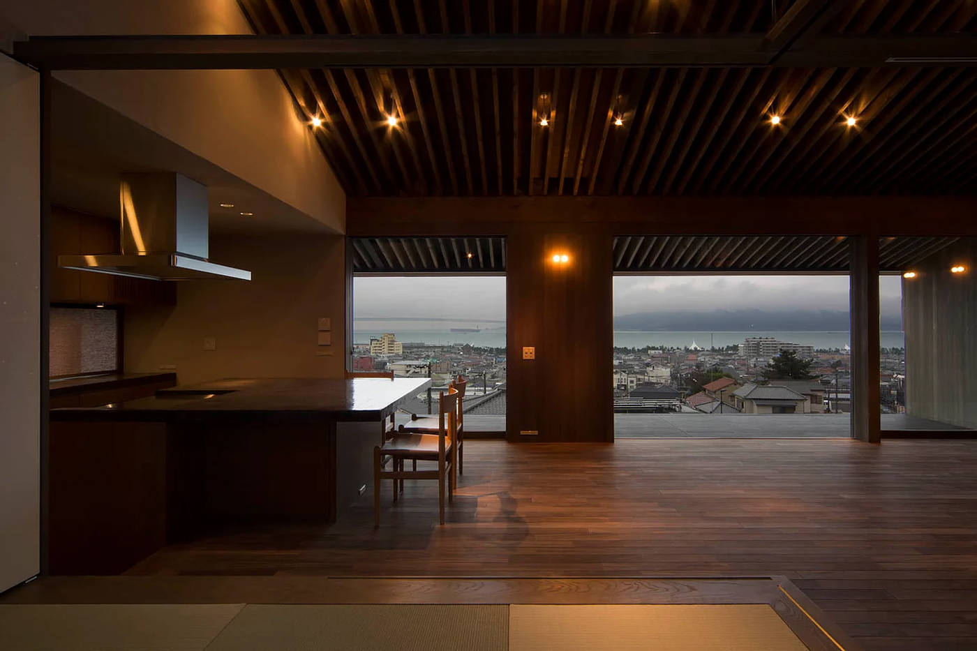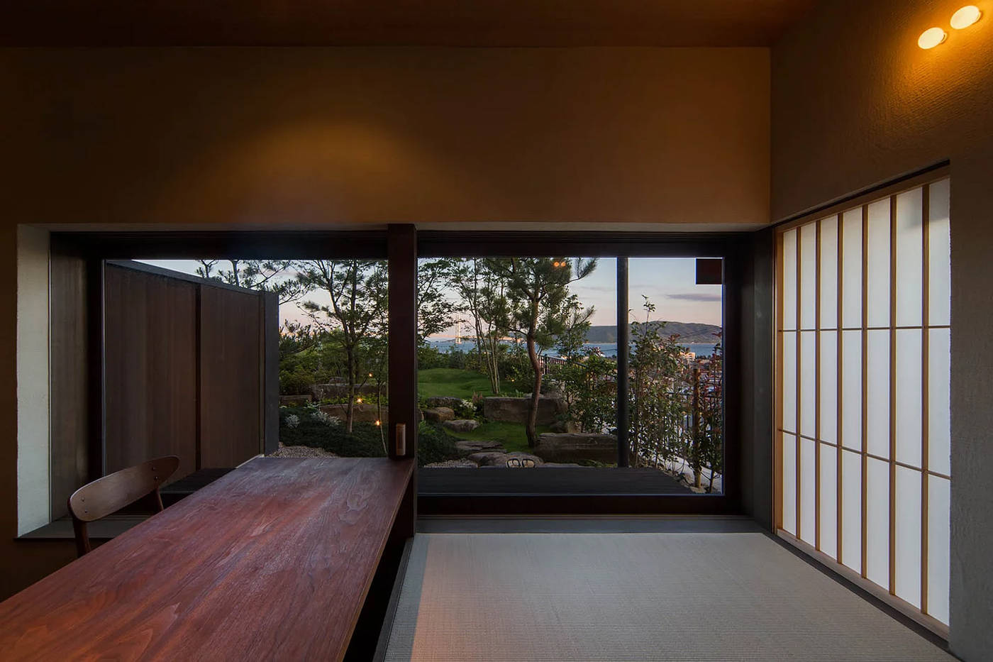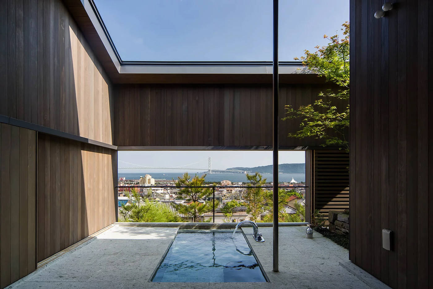 明石海峡大橋と対岸の淡路島を臨む住宅です。