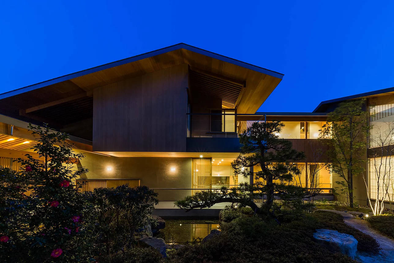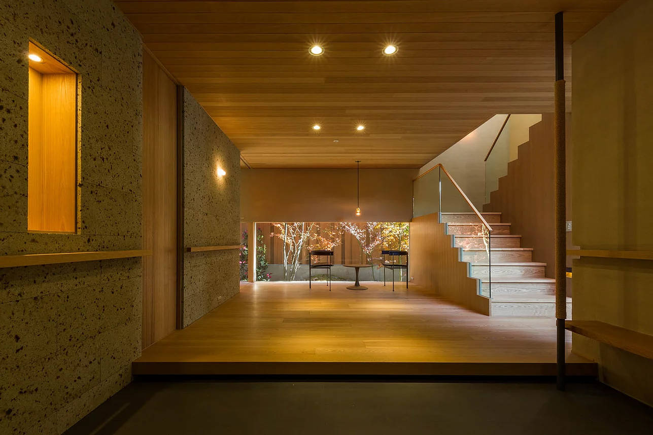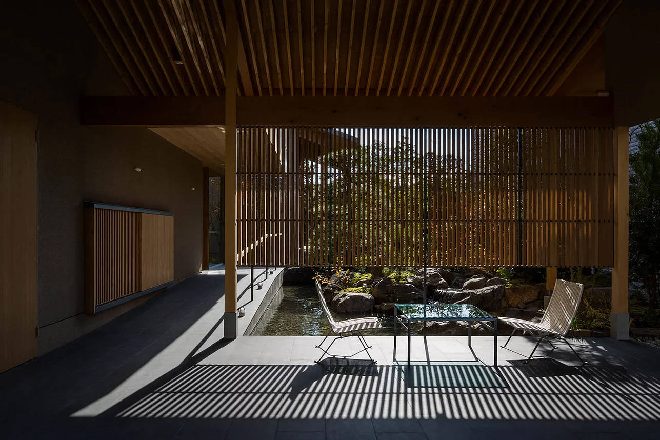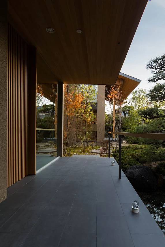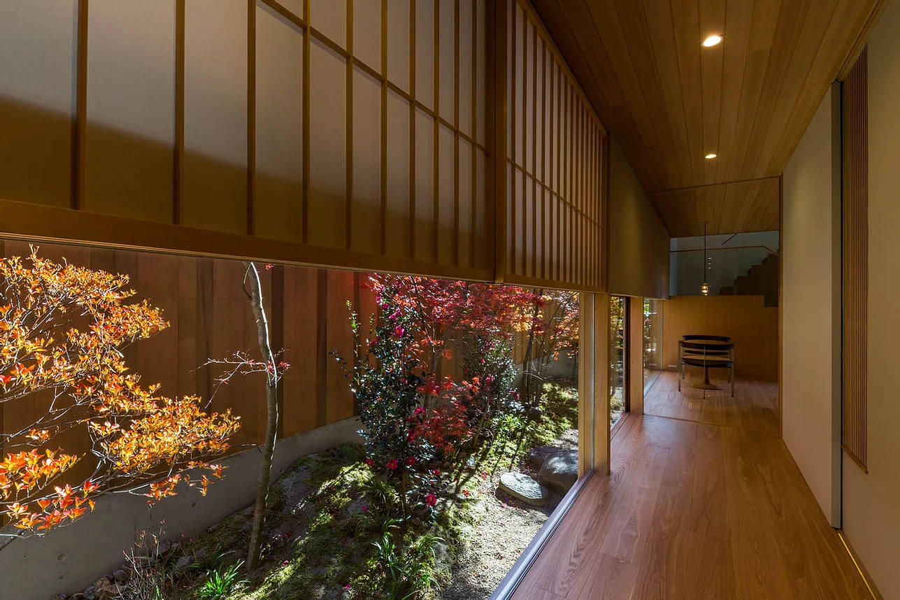 ご夫妻二人だけの住まいですが、ご親族で集まる機会も多く、2人での生活空間と公のための空間、2人だけで使う時間と大勢が集う時間、いずれのシーンにおいても違和感のない広さ感と、公私の緩やかな分離を念頭に設計を進めました。旧邸にも愛着をお持ちでしたし、庭の木々はできるだけ残したいという要望もあり、家は取り壊してしまうものの、以前の建物のもつ佇まいの記憶を残しつつ庭の木々を生活の中により身近に取り込んでいけるよう考えました。旧邸の玄関があった場所には今回建て替えた住宅と既存の3階建て住宅を半屋外でつなぐ屋外ロビーを 設けています。ここは、これまでお住まいだった3階建て住宅に息子さんご家族が暮らすため二世帯をゆるやかに つなぐ共通の玄関としての役割を持っています。庭の見え方については、庭全体を見わたすのではなく、それぞれの場所から切り取られた自然の風景として見えるよう開口部を制限しています。屋外ロビー正面からは格子越しに透けて見えるように足元から水に映る緑が垣間見え、玄関ホールでは地窓から水平に広がる緑を見せています。