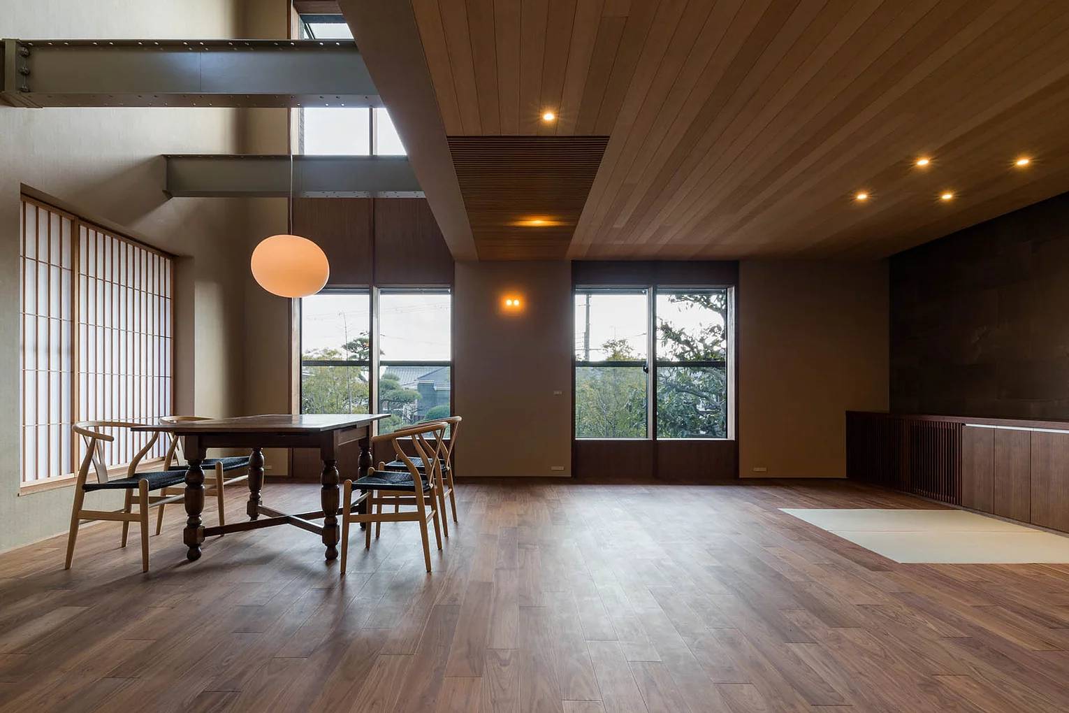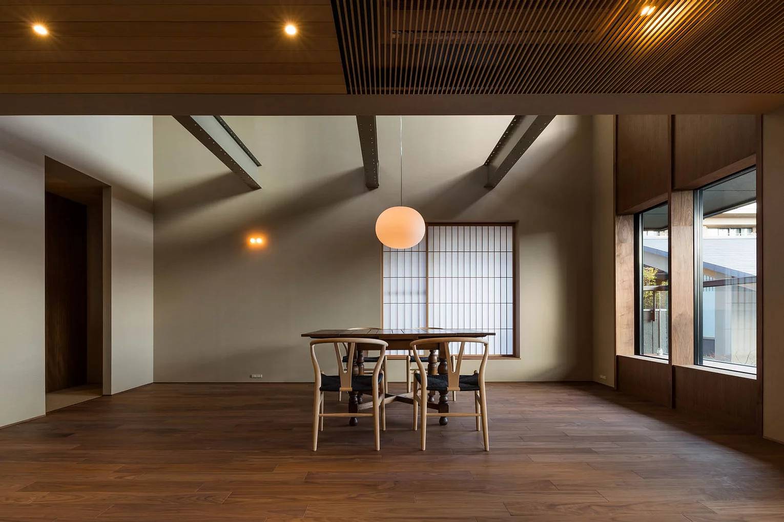 築20年程度の鉄骨造メーカーハウスの間仕切を整理し一部の床を抜いて吹き抜けのある広々としたLDKを獲得しています。
