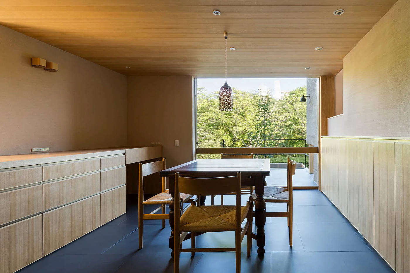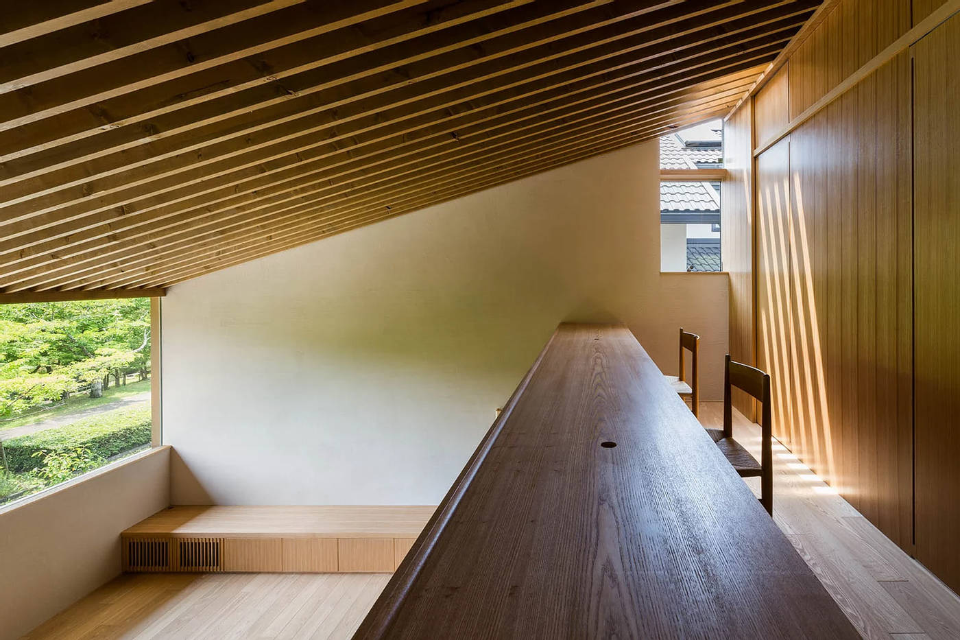 道路から半階上がったダイニングと、そこから半階上がったリビングには、目の前の桜並木を眺めるための大きなガラス面を配しました。
