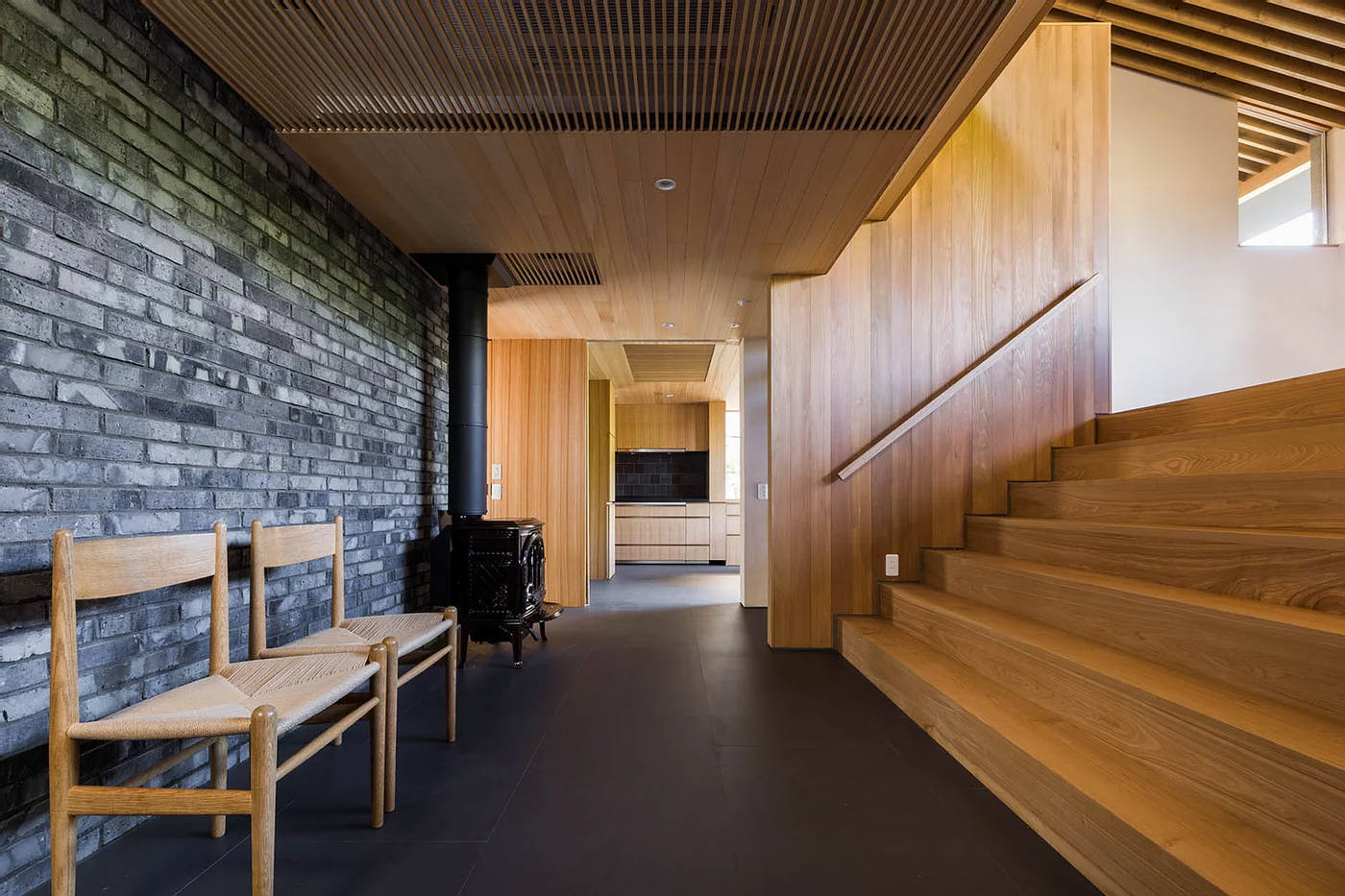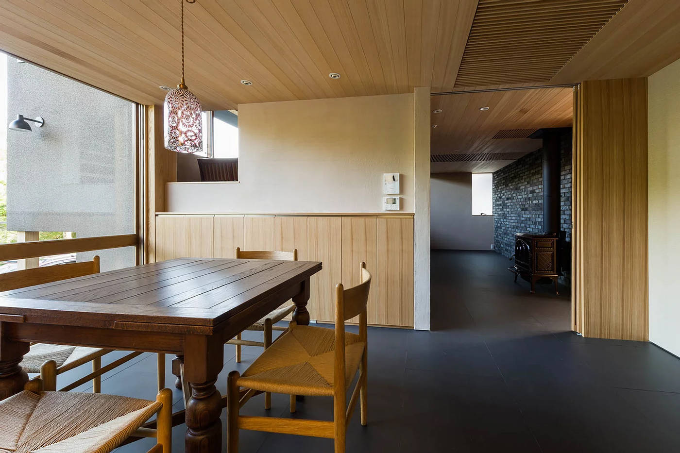リビングとダイニングはあえて独立した空間として距離をとり、それらをつなぐ家の中心に薪ストーブのあるホールがあります。